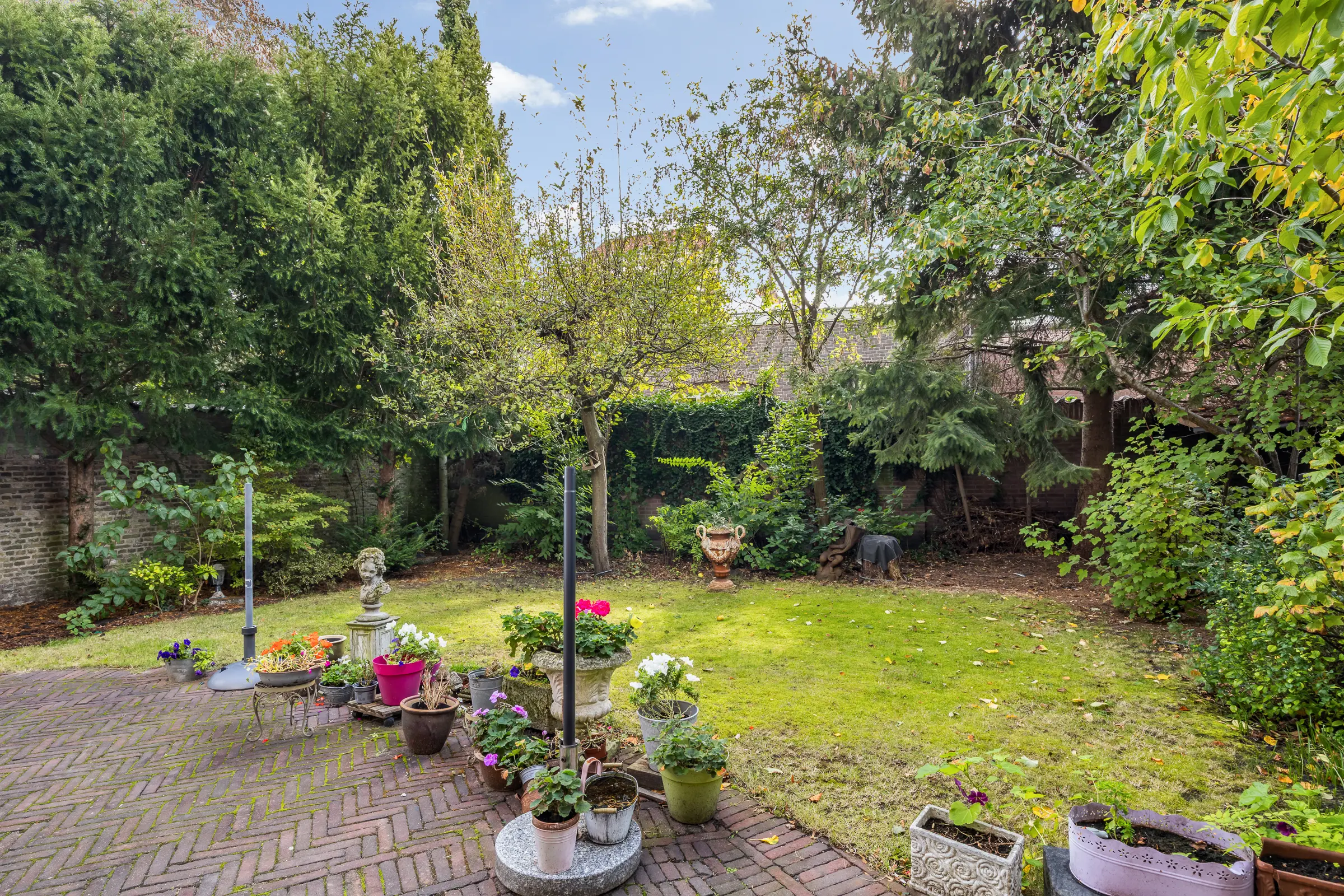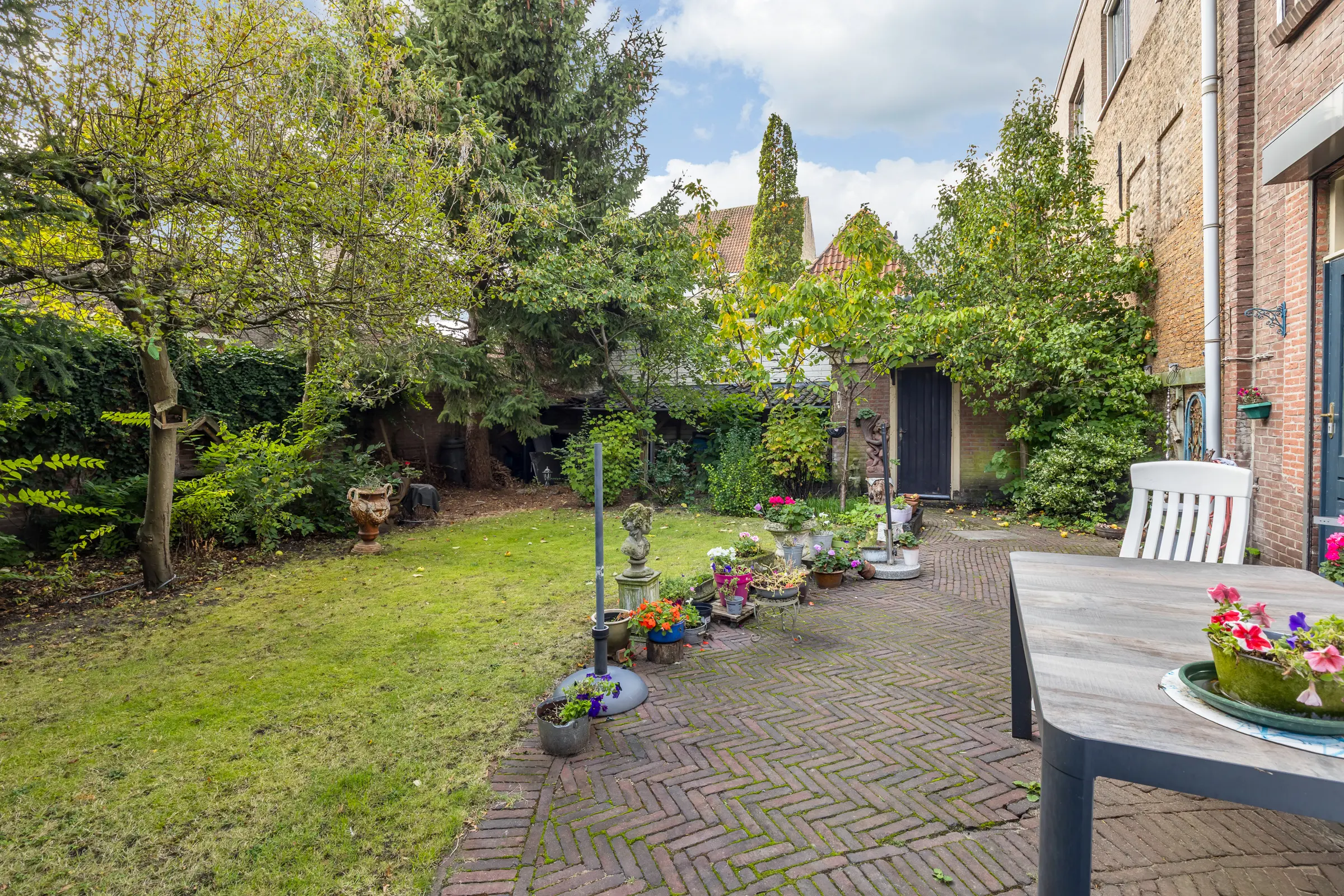 Een prachtige ommuurde tuin, privé en beschut, waar het goed toeven is in de zomer maar zeker ook geschikt voor groenliefhebbers en lange avonden voor ontspanning maar ook prachtige fruitbomen zoals pruim, peer, appel, kers en notenboom.