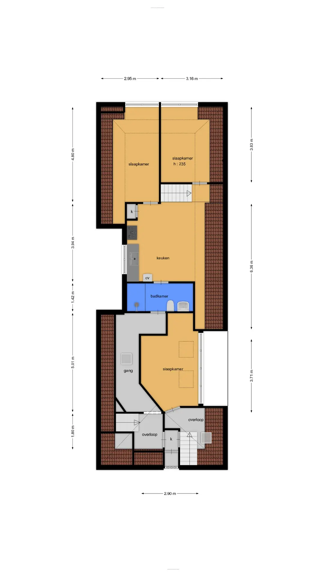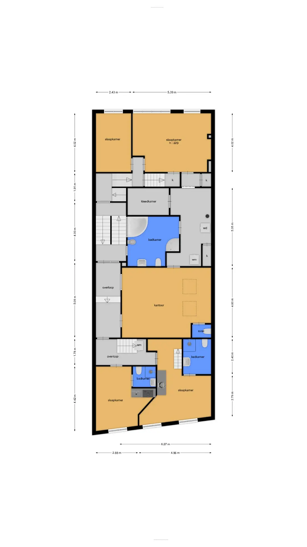 Op de bovenverdieping 2 ruime slaapkamers, een grote badkamer en een 3e kamer ingericht als kantoor / alternatieve slaapkamer.