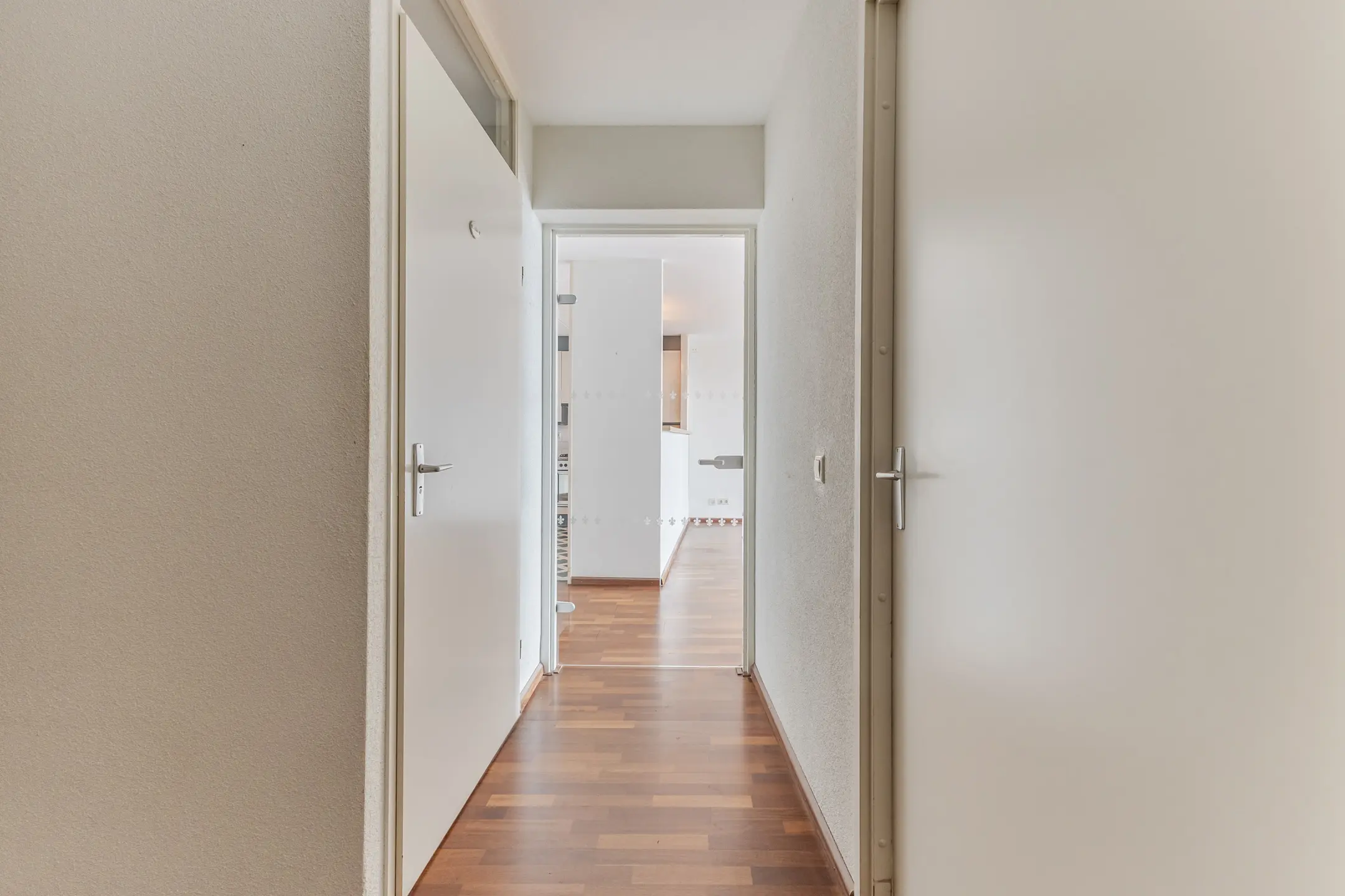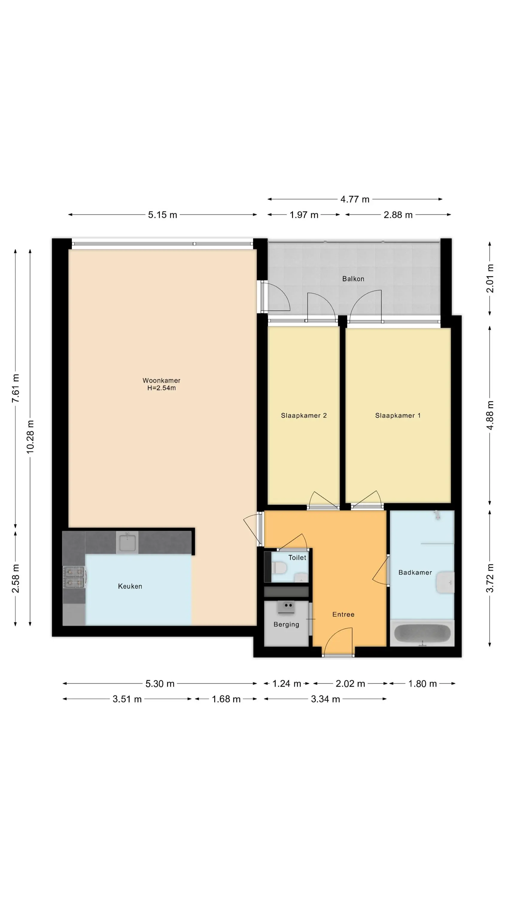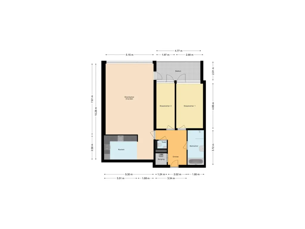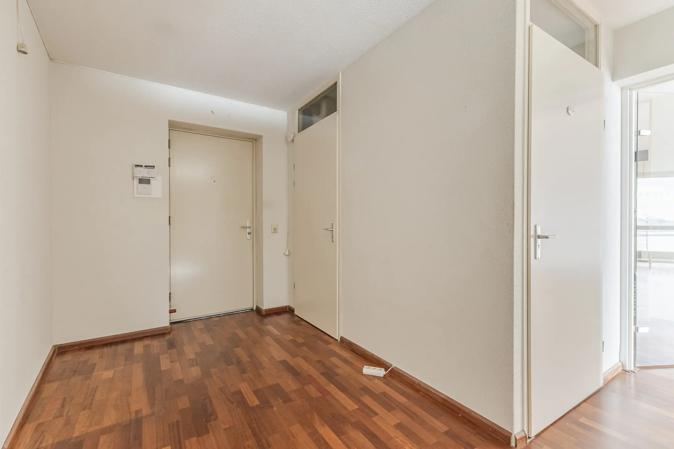 De entreehal biedt ruimte voor een garderobe en geeft toegang tot alle vertrekken: de lichte woonkamer met open keuken, twee slaapkamers, het toilet, de badkamer en de inpandige berging/wasruimte.
