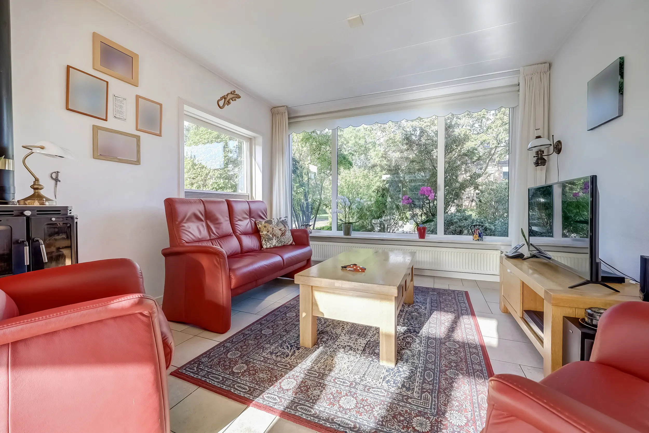 Wat een licht! De woonkamer is een echte doorzonkamer, waar het daglicht volop naar binnen stroomt. In het midden van de kamer is een fraaie houtkachel geplaatst, die een gezellige sfeer creëert. Er is voldoende ruimte voor een grote zithoek en aan de achterzijde van de woonkamer kunt u via de openslaande deuren de tuin bereiken. De afwerking van de woonkamer is met een nette tegelvloer en spachtelputzwanden, wat zorgt voor een moderne en onderhoudsvriendelijke uitstraling. Vanuit de woonkamer komt u ook in de halfopen keuken.