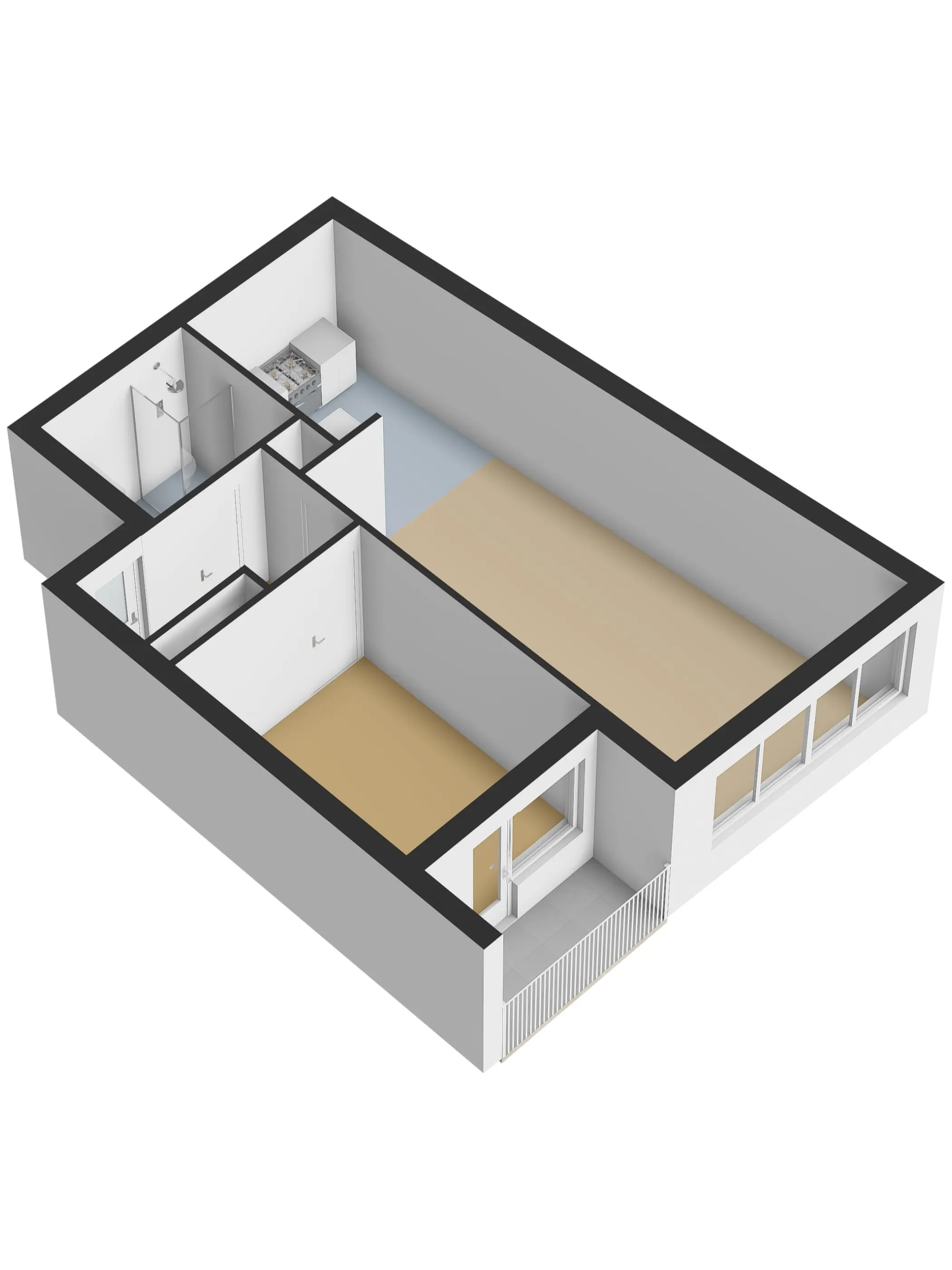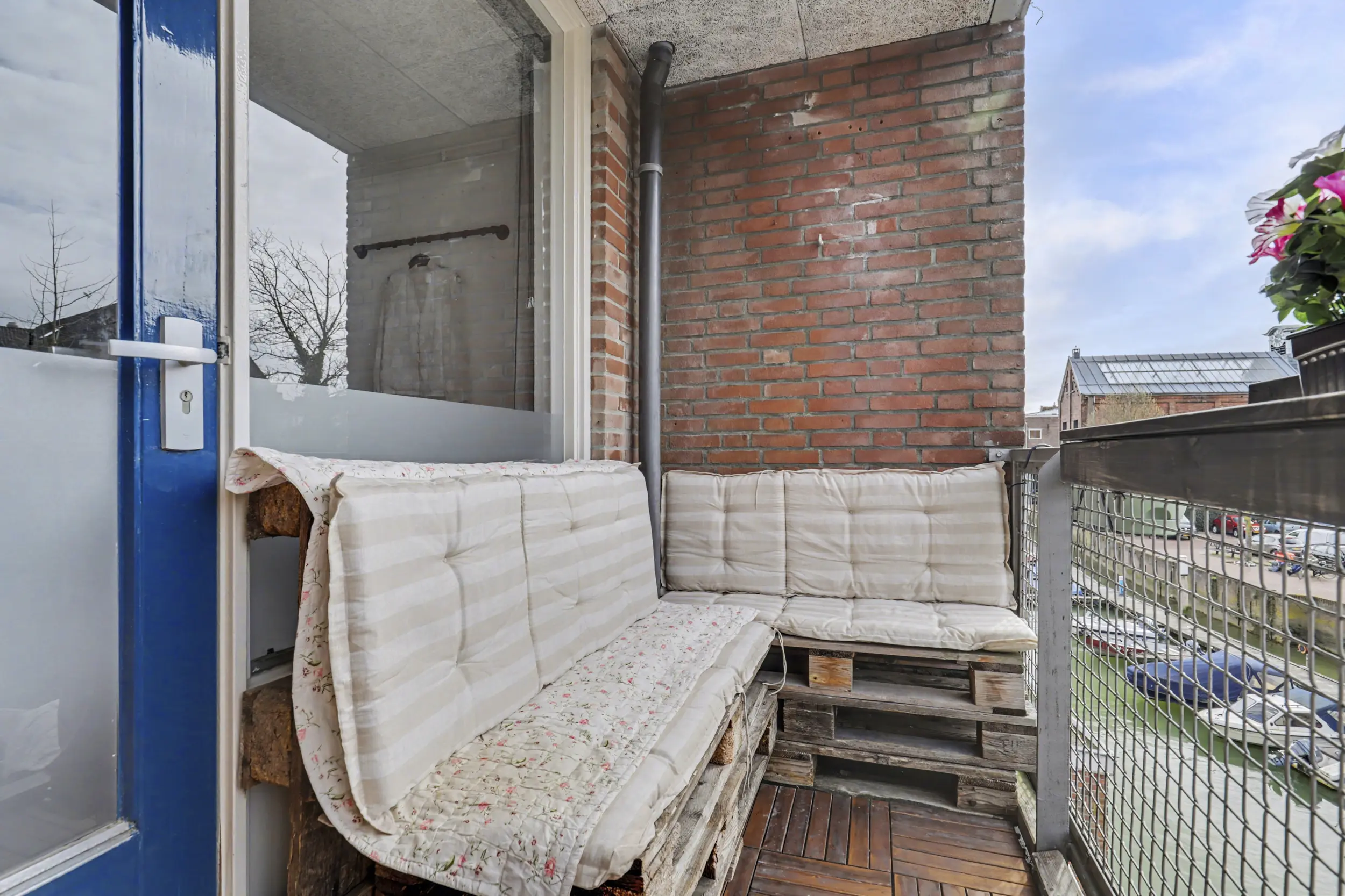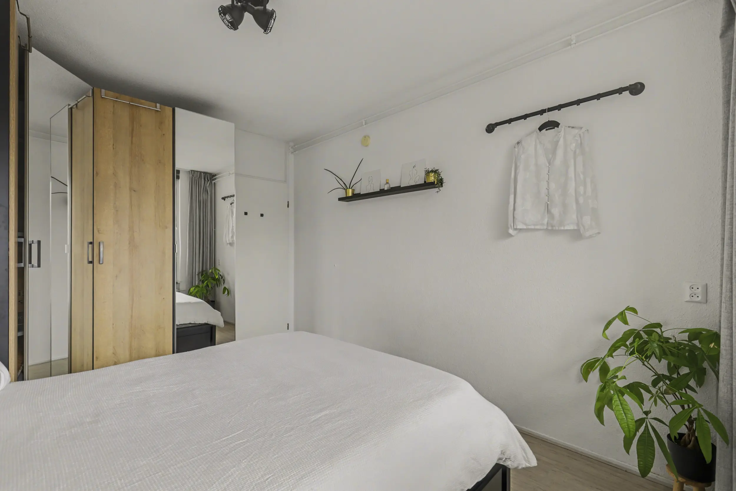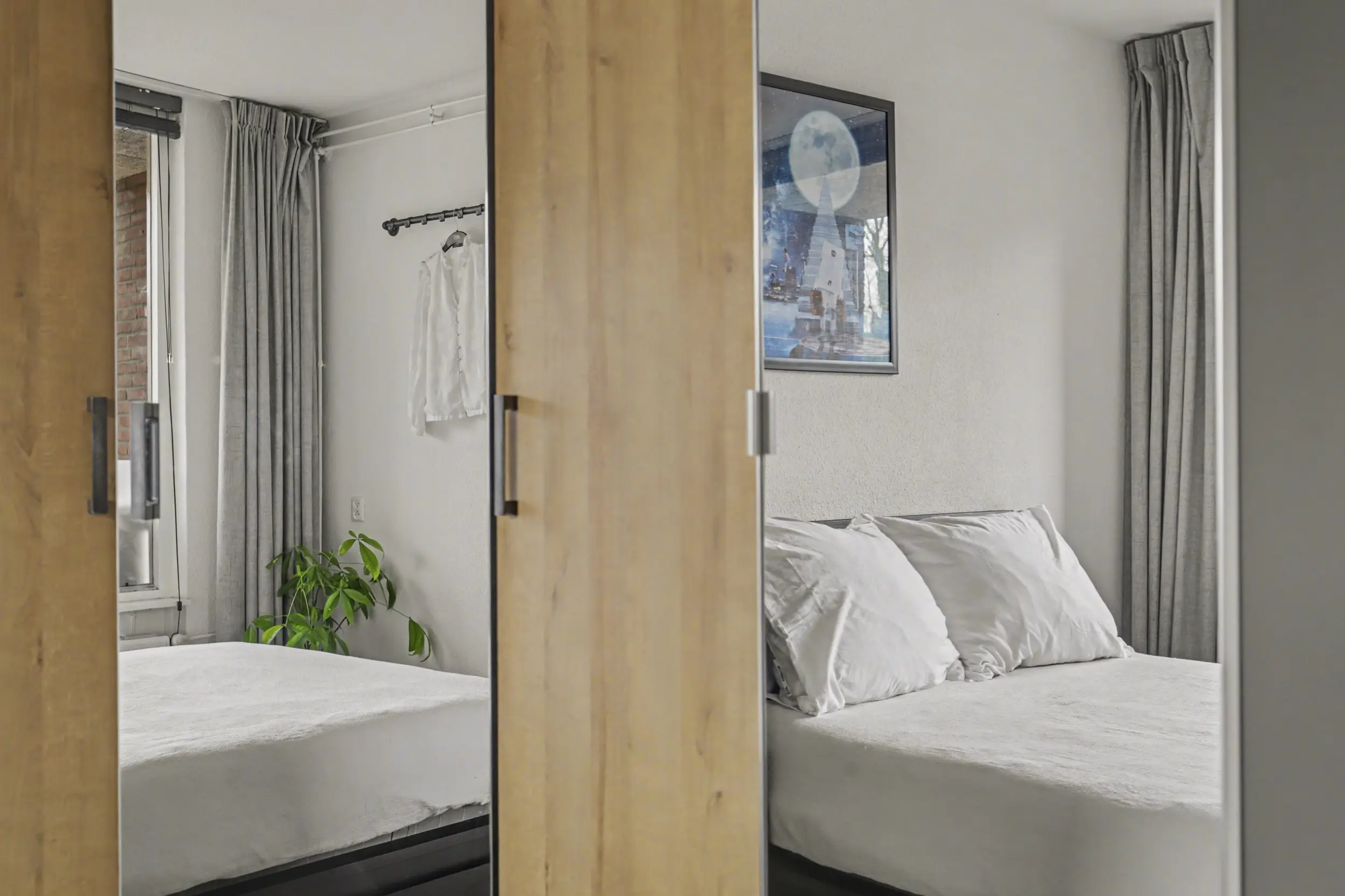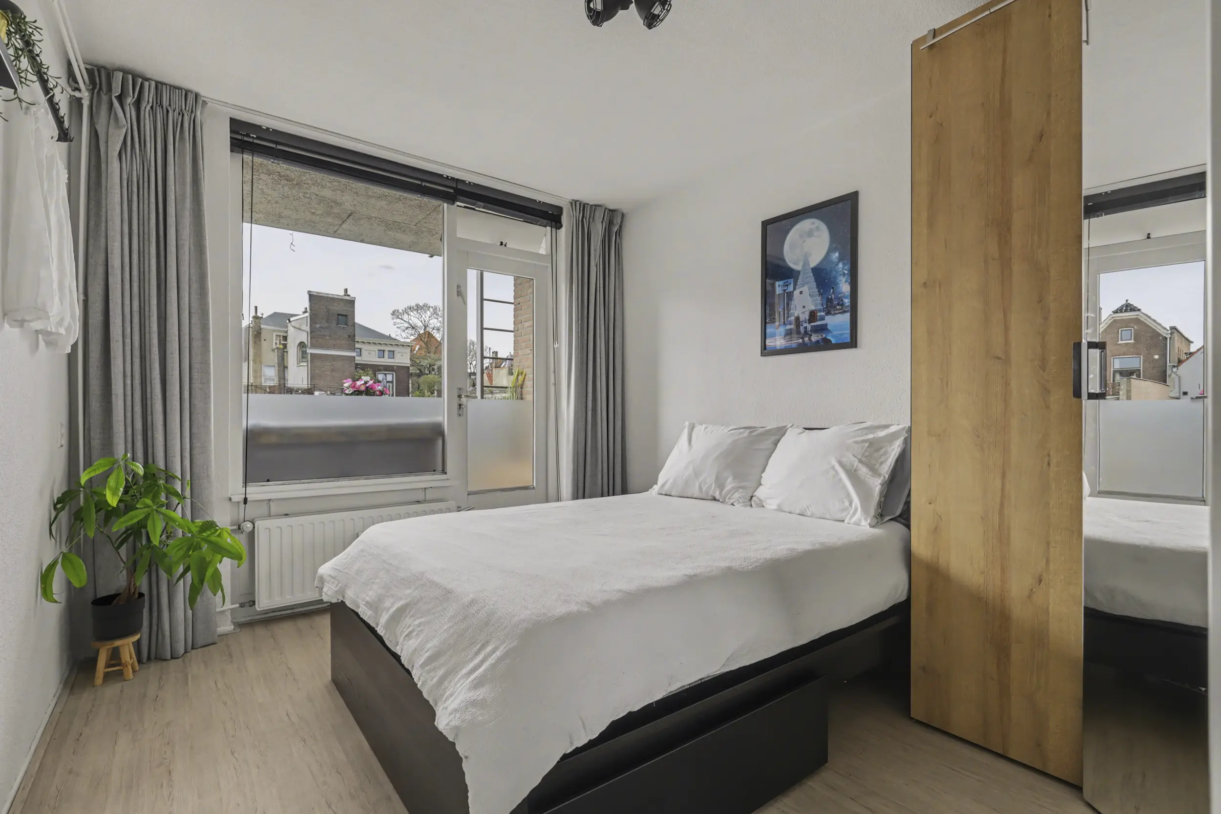Aan de achterzijde van het appartement vind je de ruime slaapkamer. Het fijne aan deze kamer? Je stapt vanuit je bed zo het balkon op! Het balkon ligt gunstig op het westen. Dit is dé ideale plek voor lange zomeravonden; heerlijk genieten van de zon en een goed glas wijn na een lange werkdag.
