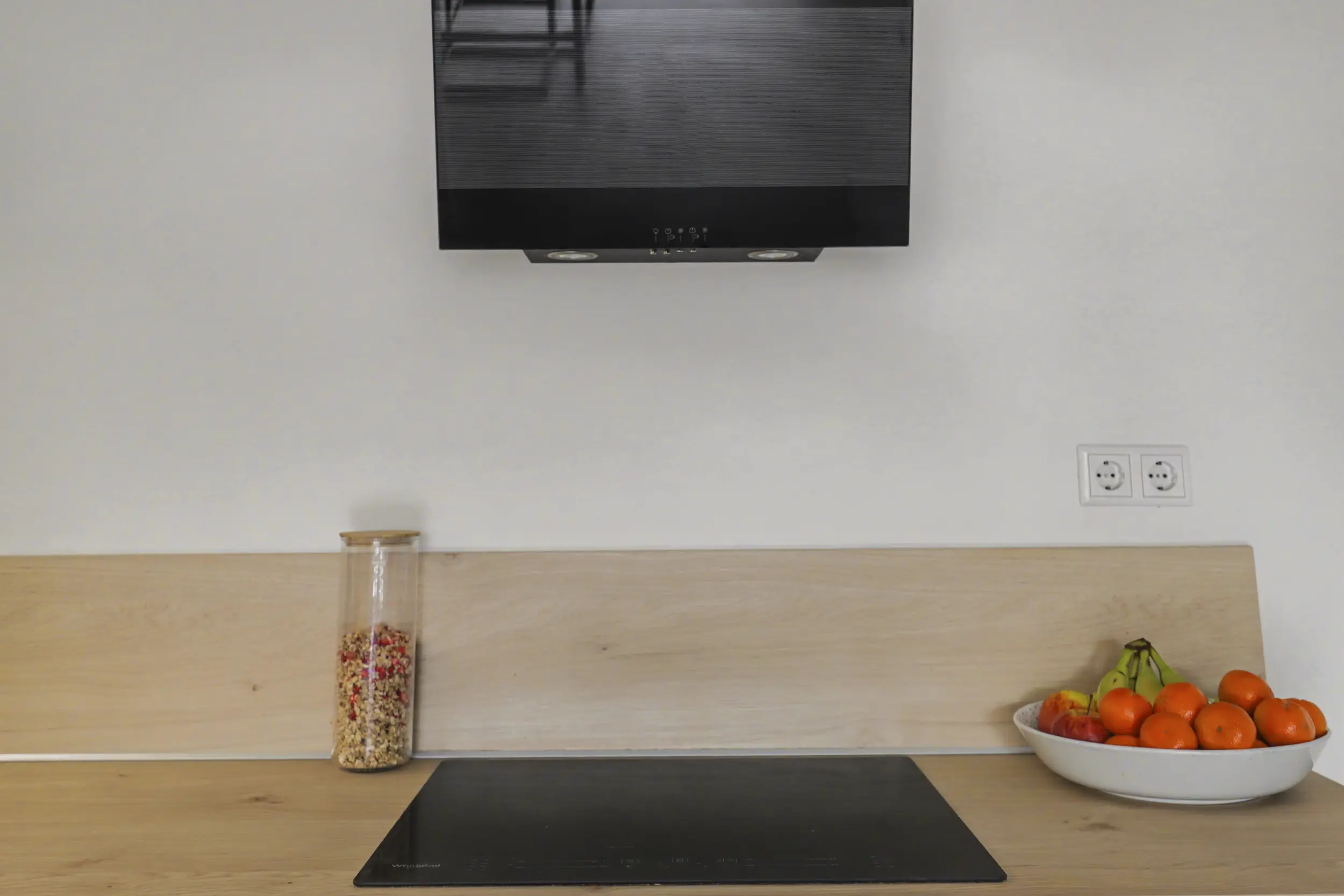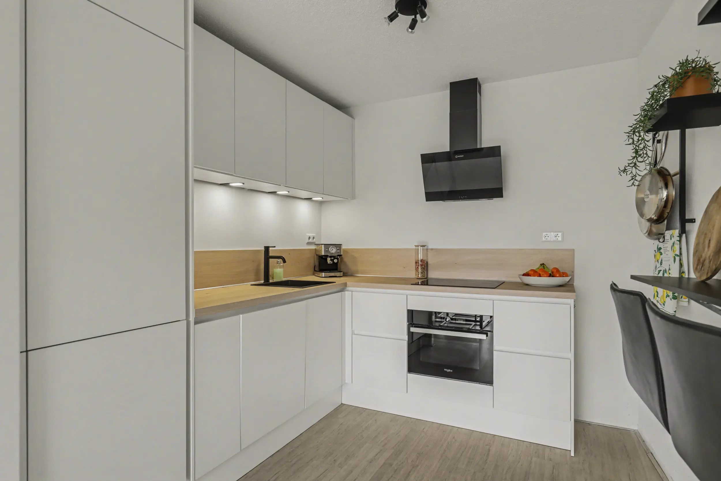De open hoekkeuken sluit naadloos aan op de woonkamer. Deze moderne eyecatcher is in 2021 geplaatst en van alle gemakken voorzien. Koken doe je op de inductiekookplaat onder een strakke design afzuigkap. Verder ben je voorzien van een vaatwasser, combi-magnetron, koel-/vriescombinatie en veel werkruimte op het lichte kunststof aanrechtblad.