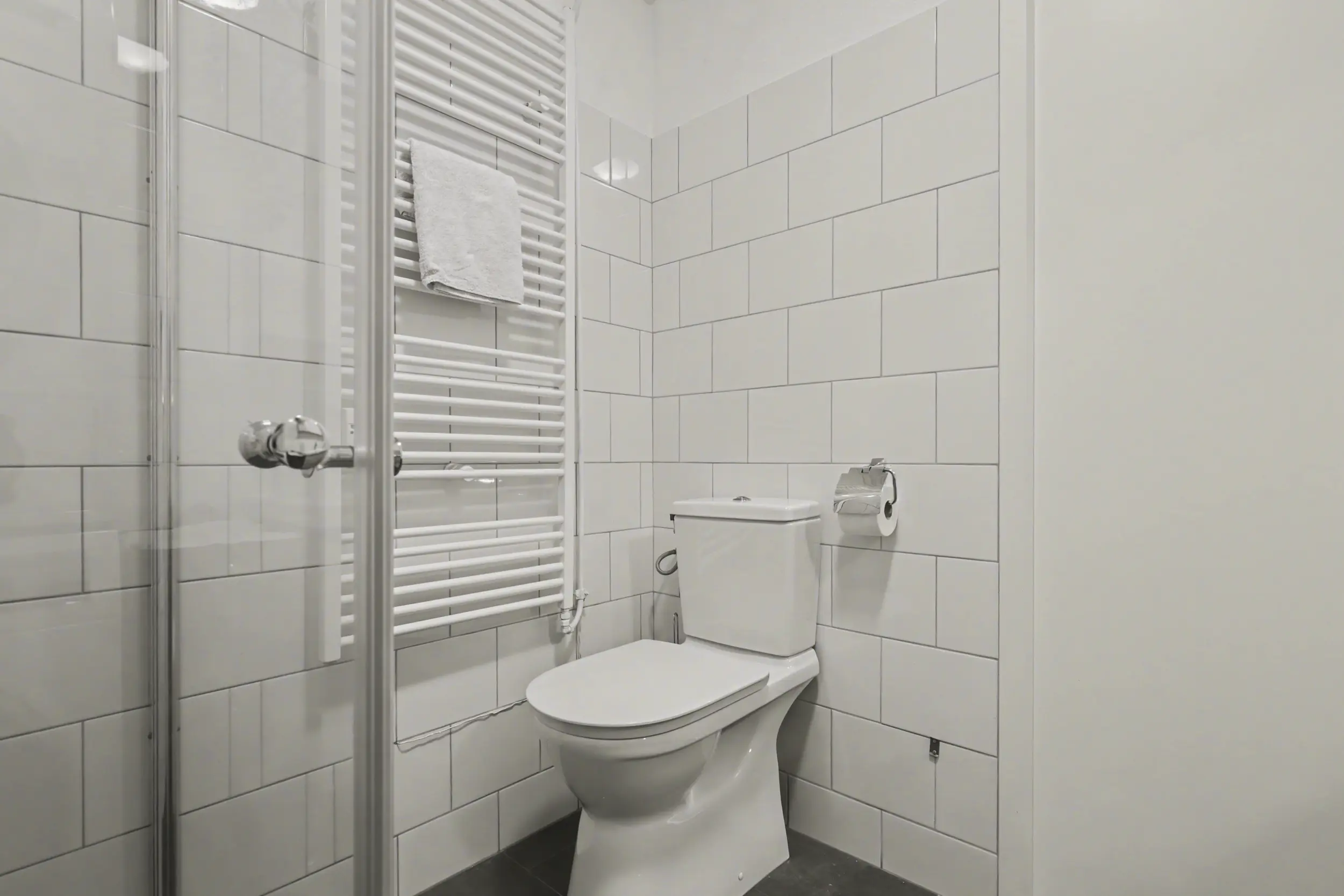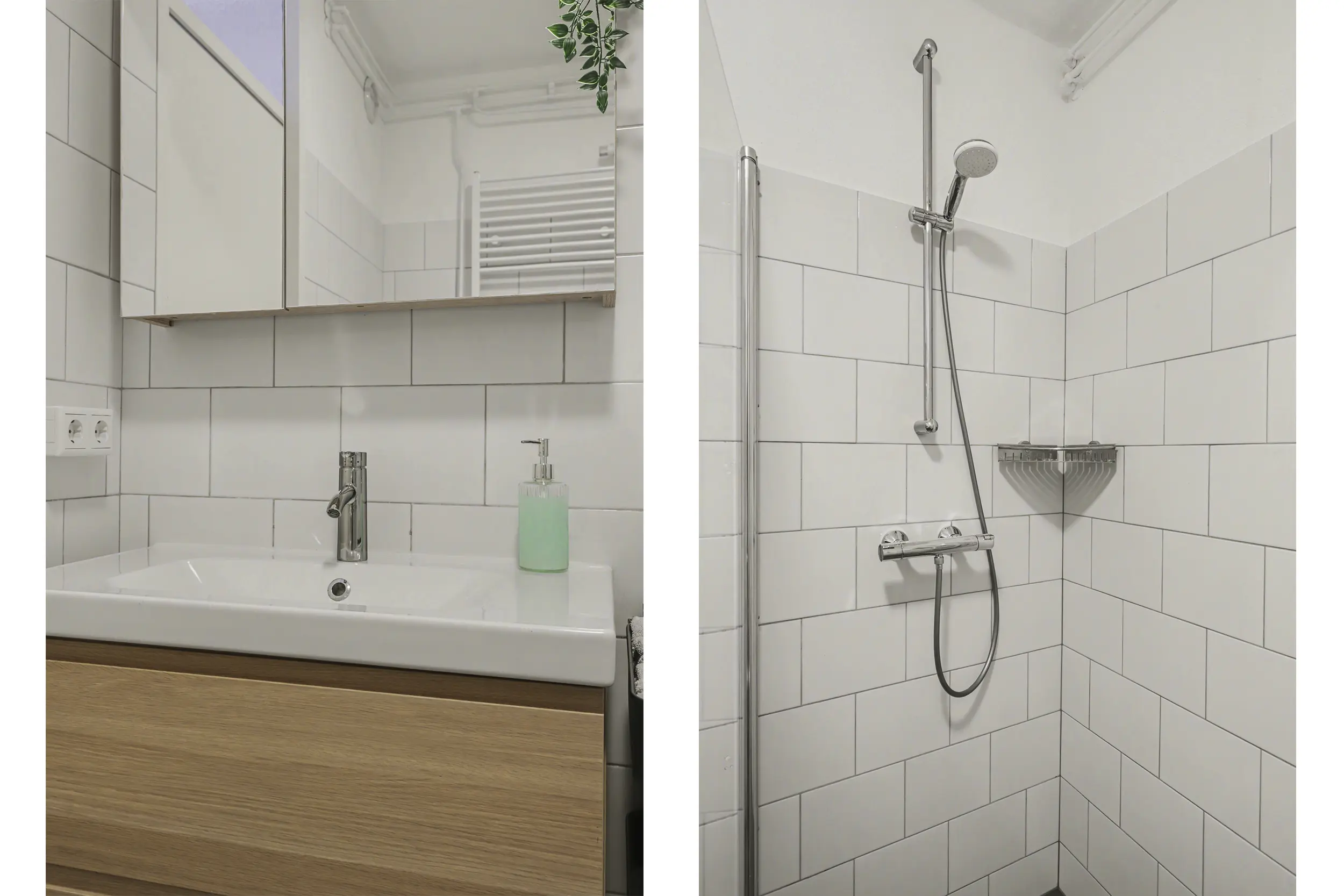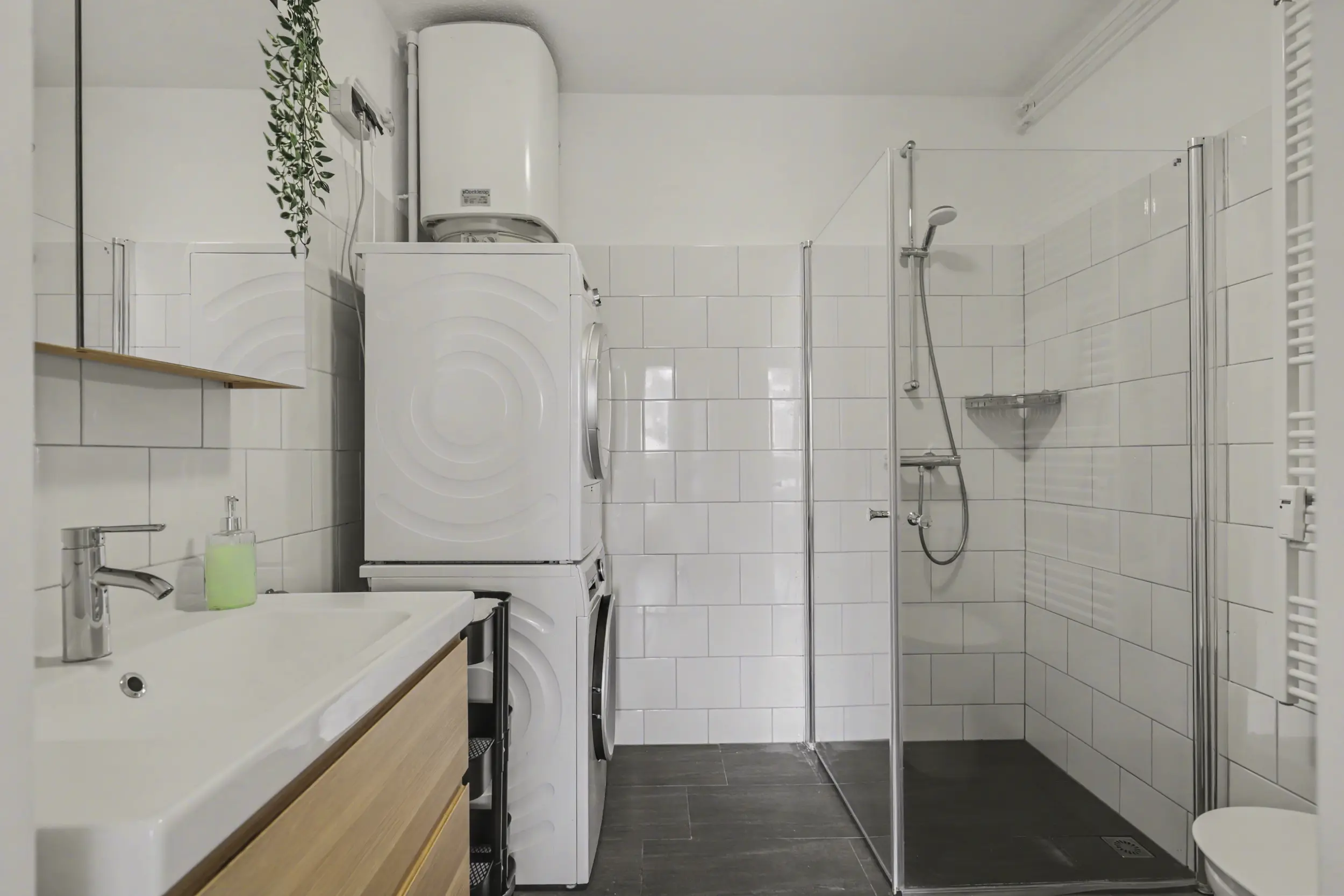 Ook de badkamer is in 2021 gerenoveerd en volledig betegeld in een stijlvolle kleurstelling. Je beschikt hier over een ruime inloopdouche met een strak glazen douchescherm, een modern wastafelmeubel met lades en spiegelkast, een toilet en een radiator. Tevens is hier netjes de aansluiting voor je wasmachine en de elektrische boiler (2008) weggewerkt.