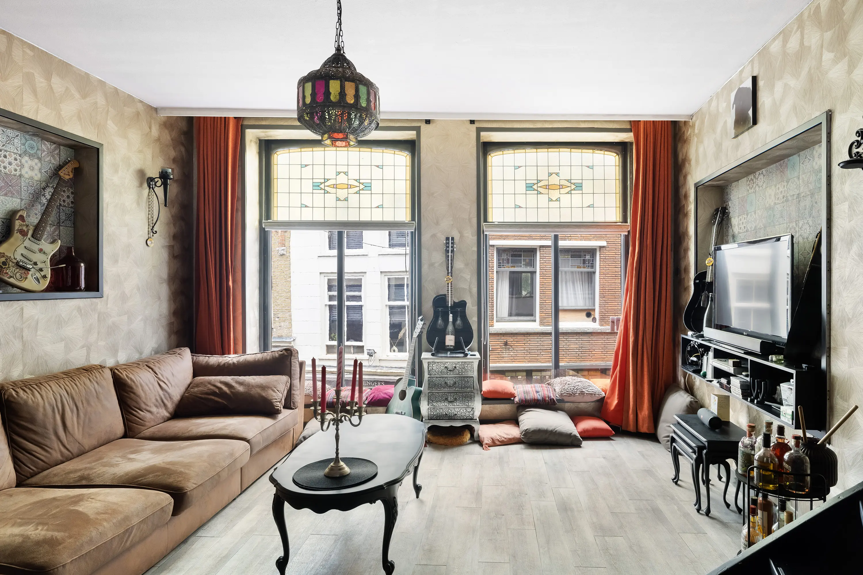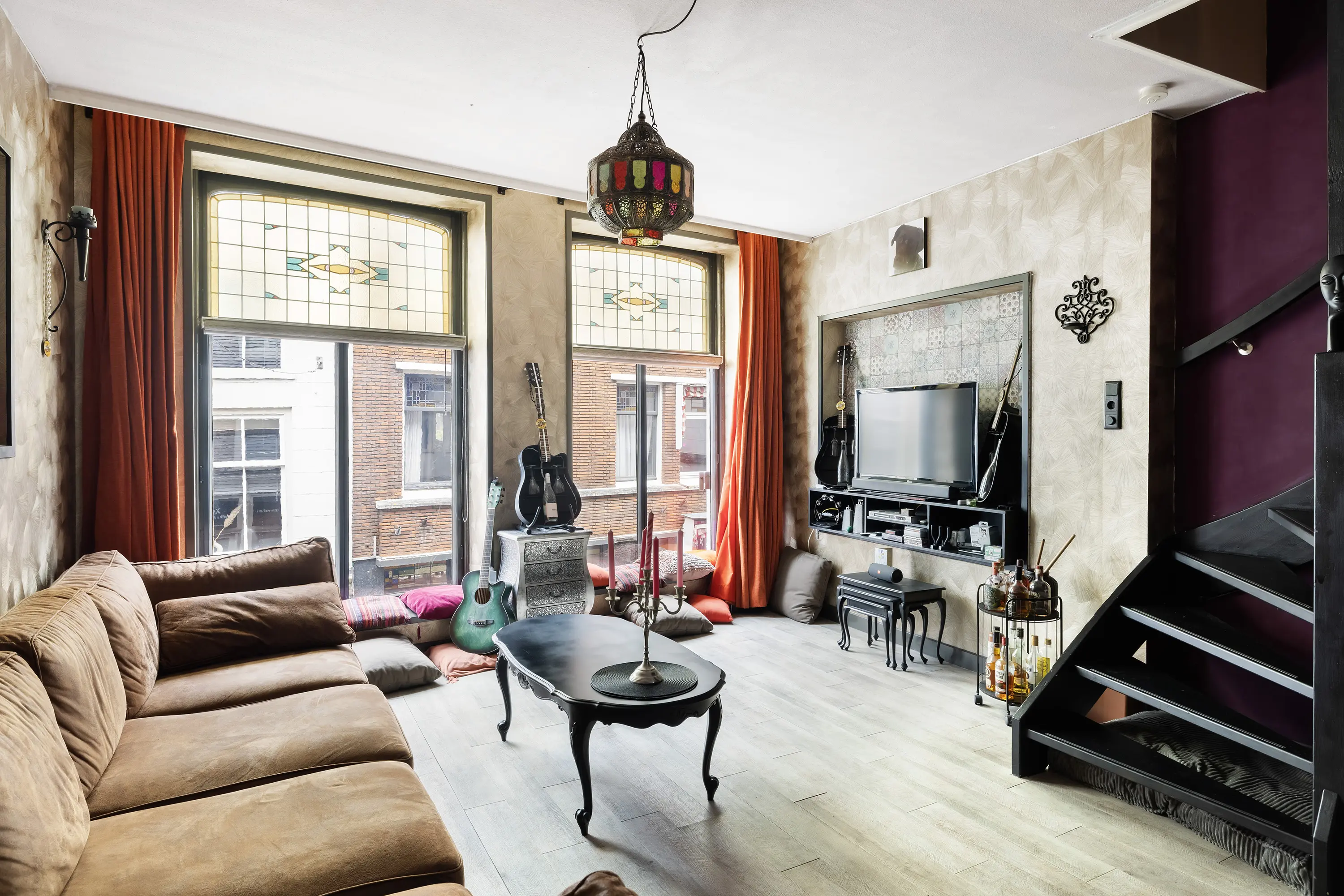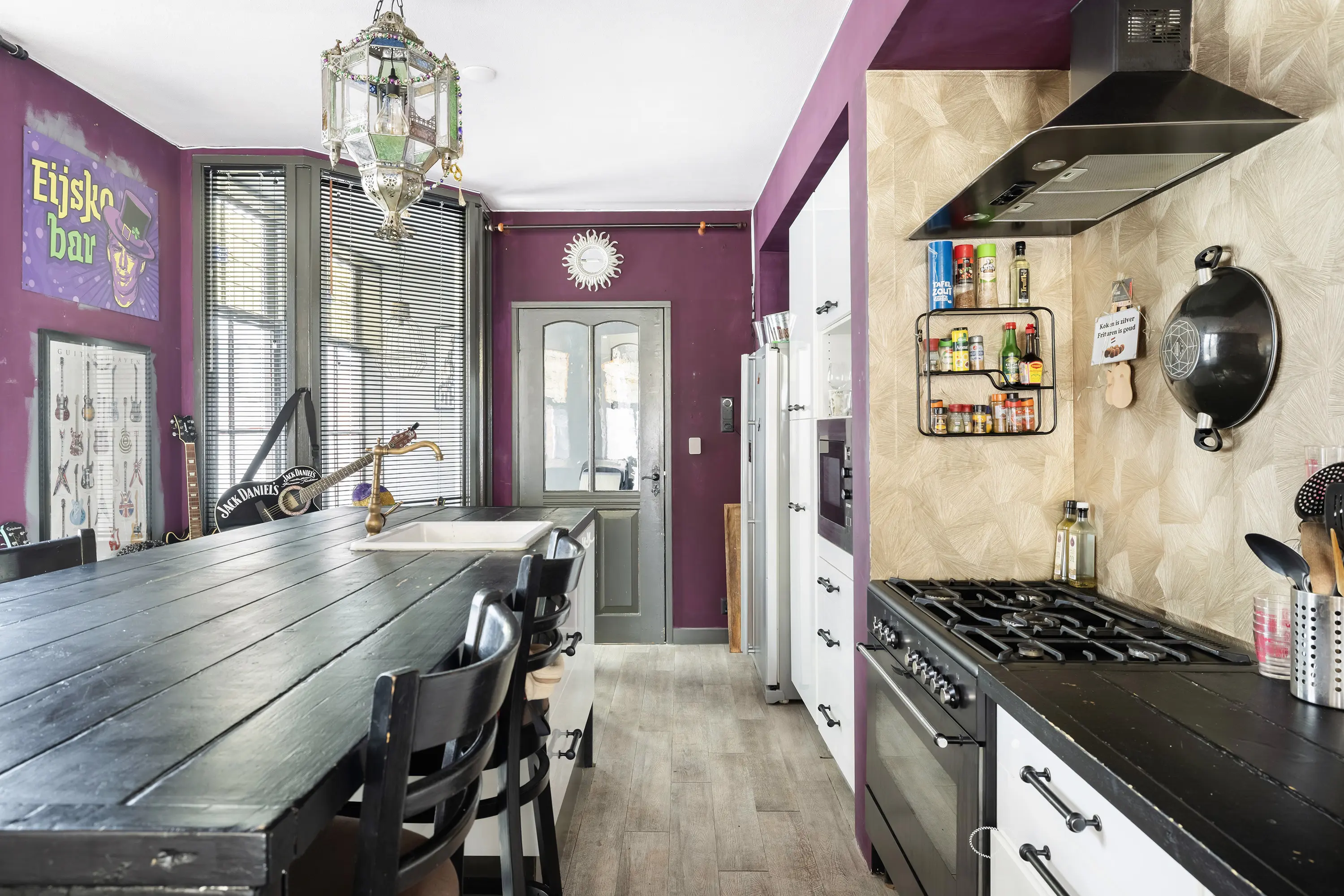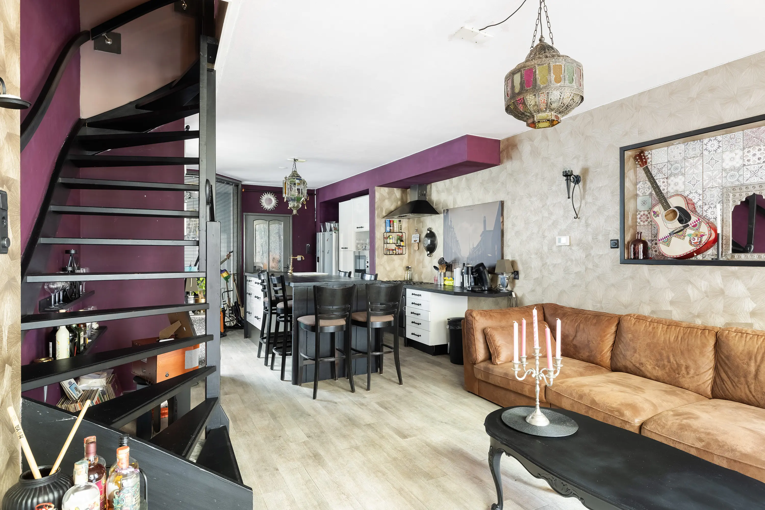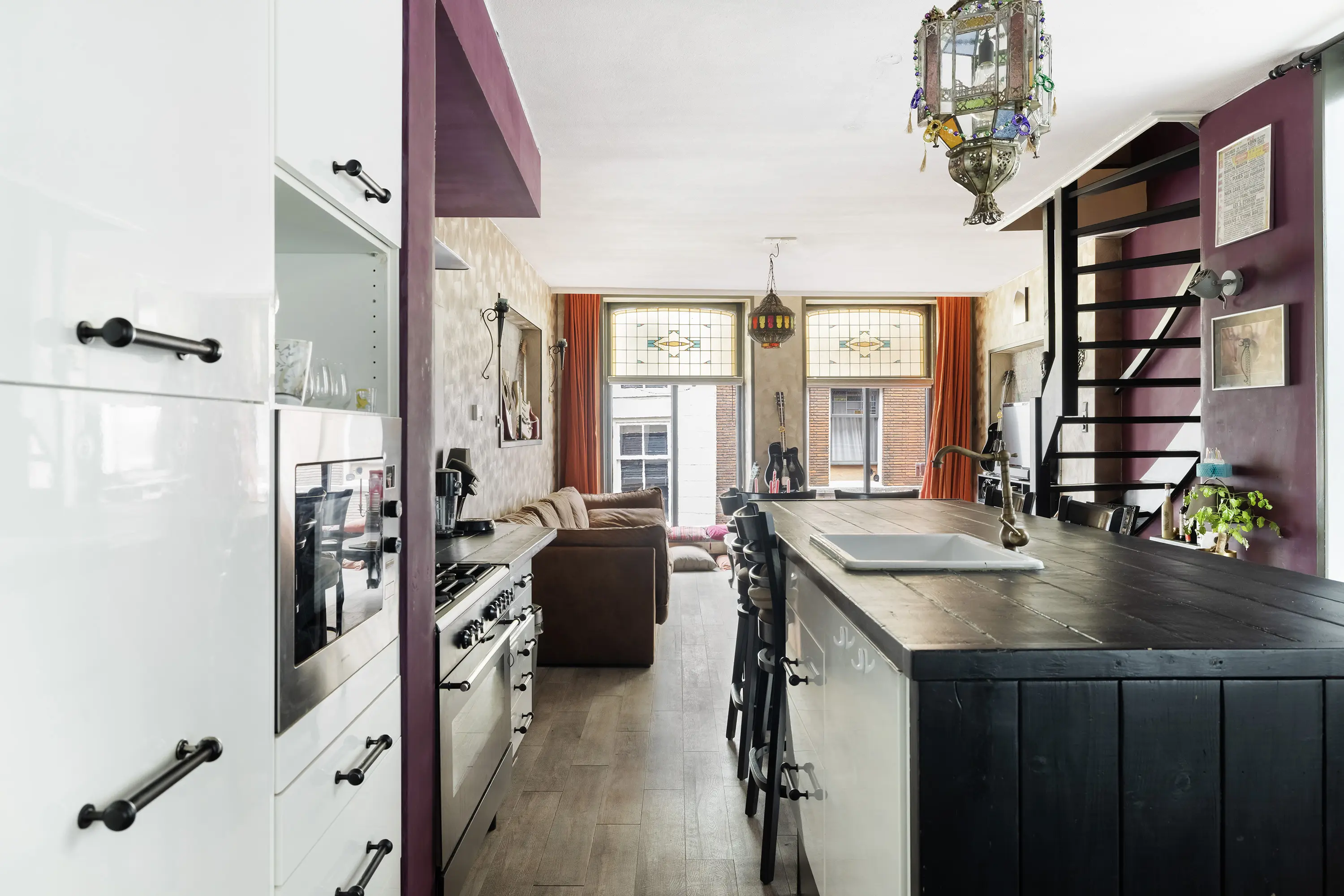 Op de woonverdieping is de heerlijk ruime woonkamer met prachtige glas-in-loodramen, gestuukte wanden en een pvc-vloer met vloerverwarming. De open keuken met spoeleiland is volledig uitgerust met moderne inbouwapparatuur, zoals een 5-pits gasfornuis, combimagnetron, koel-vriescombinatie en vaatwasser.