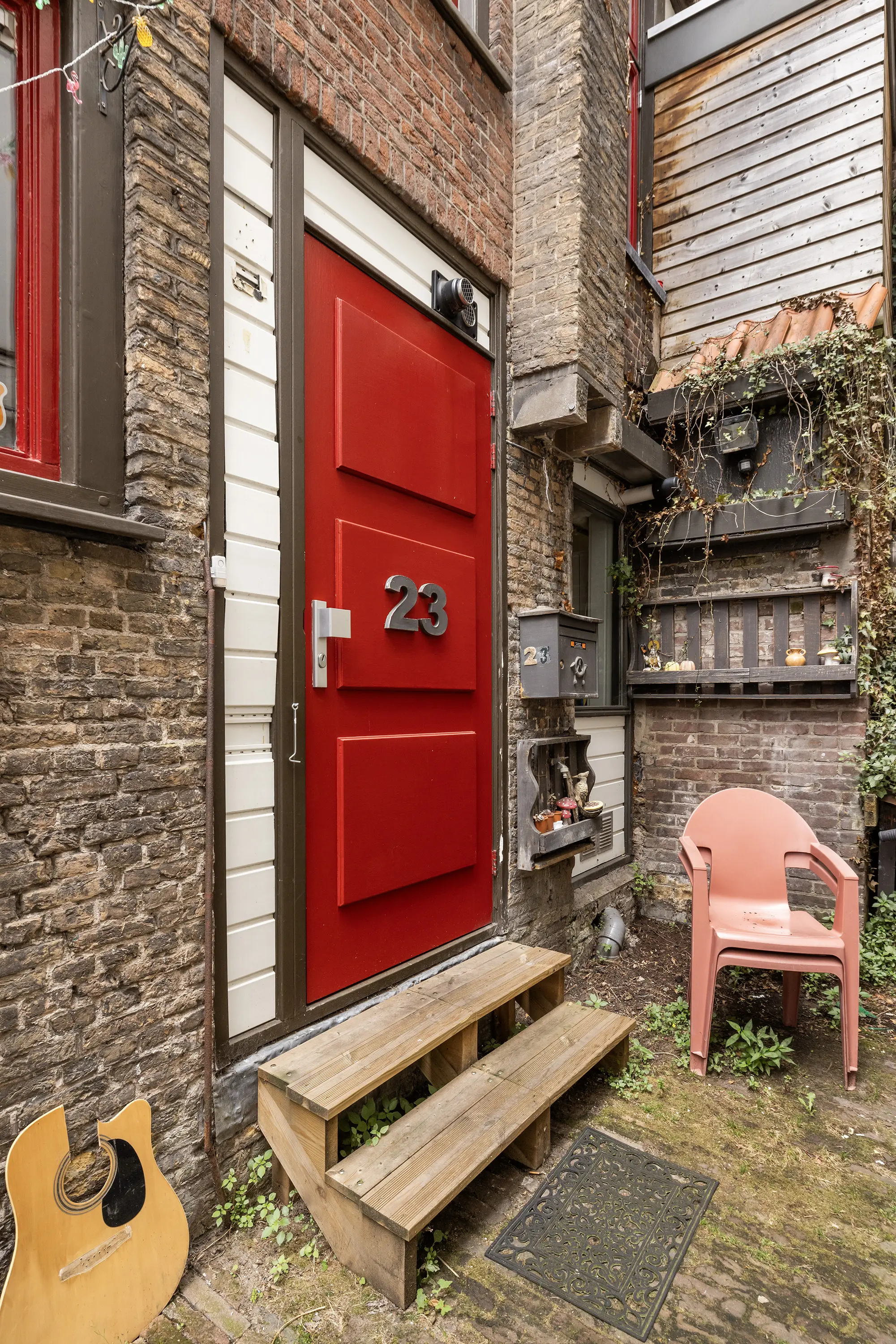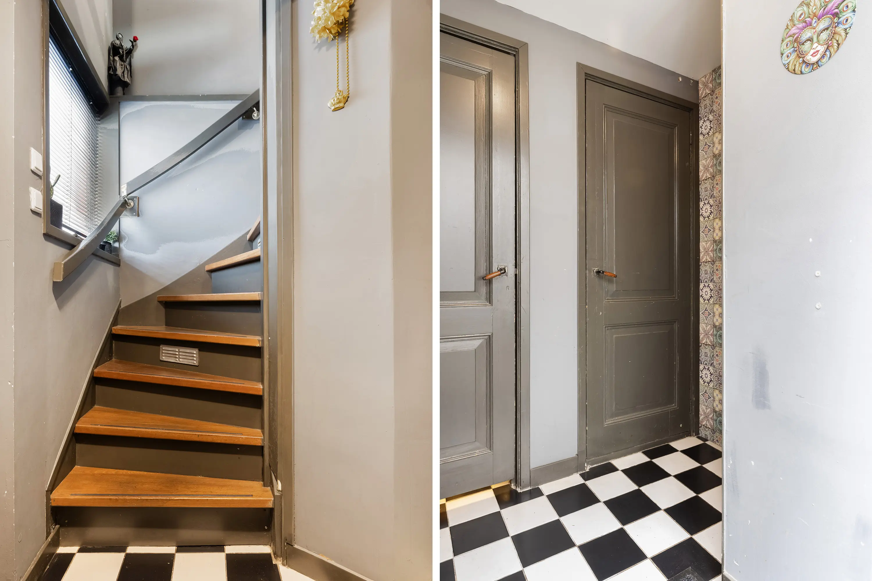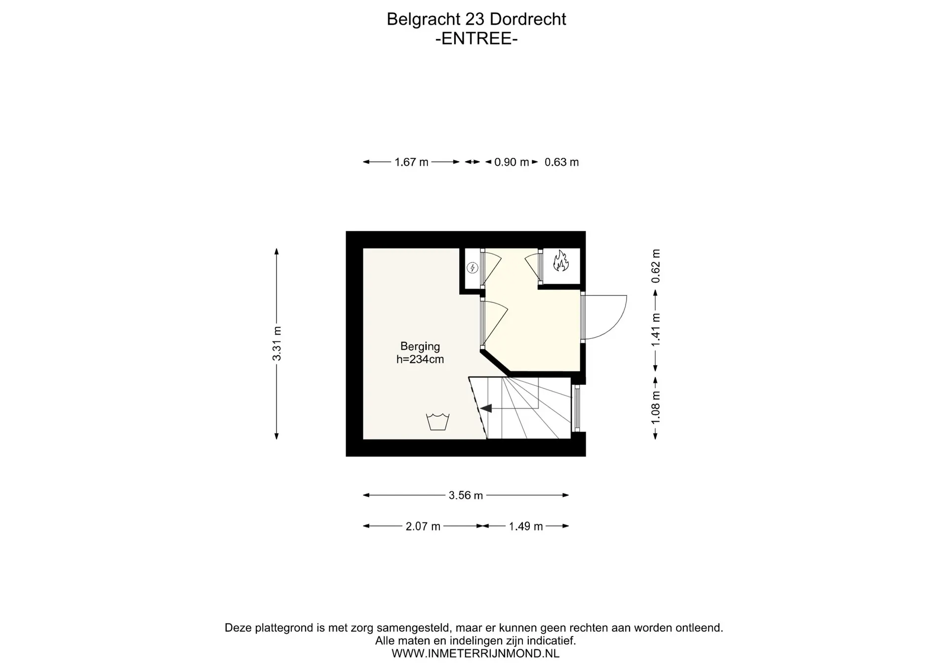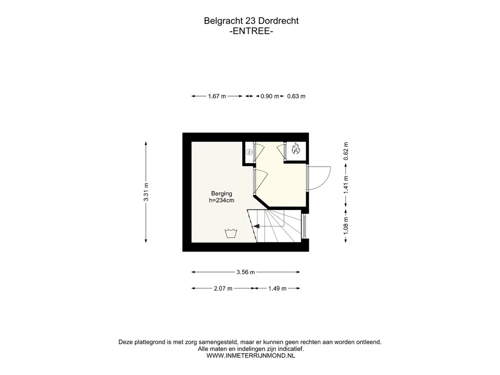 Nette hal met meterkast en berging, trap naar de woonverdieping.