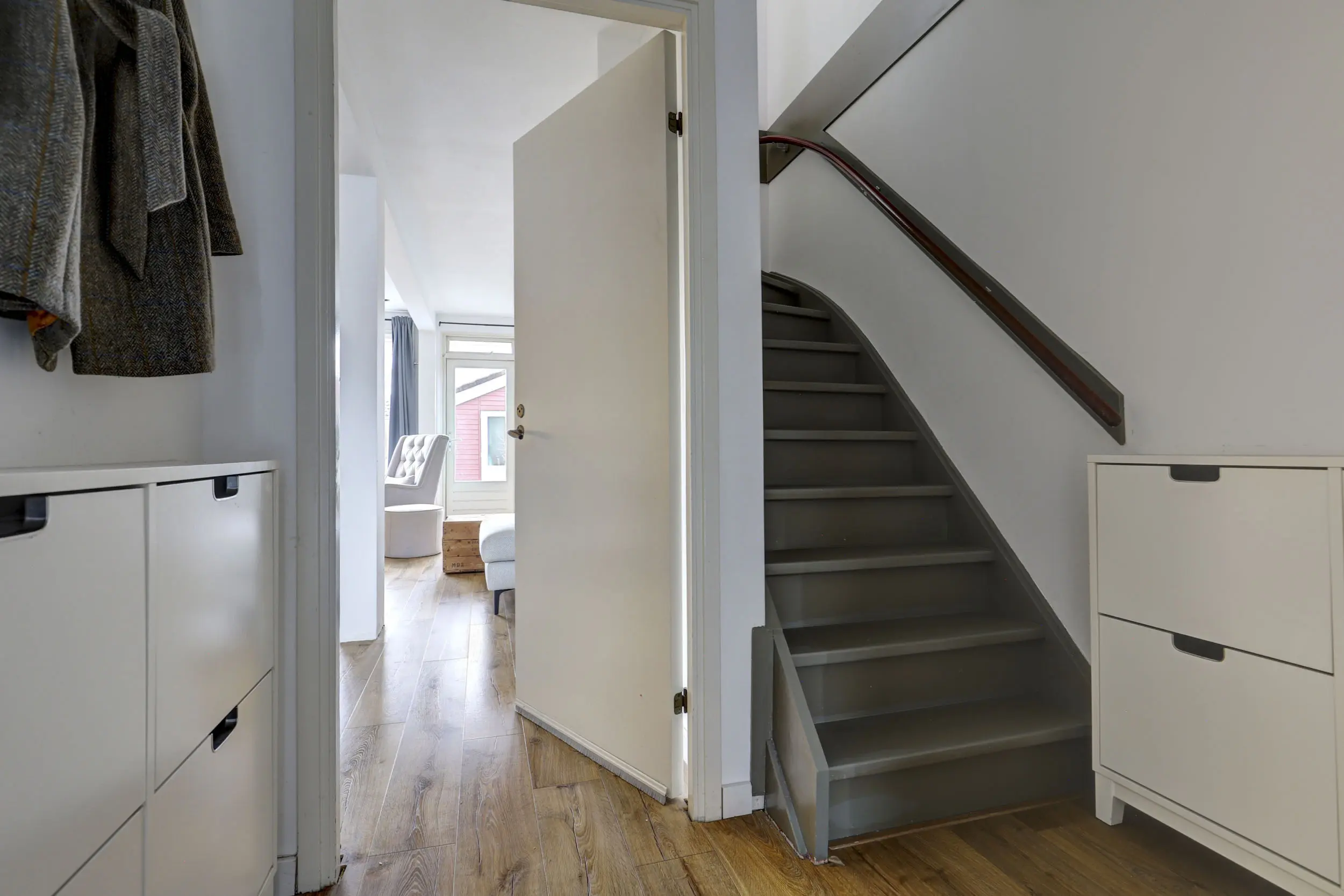 Via de overdekte voordeur, loop je deze gezellige woning binnen. De ruime hal geeft toegang tot de geheel betegelde toiletruimte met zwevend toilet en fontein, als ook de meterkast en trapopgang naar de verdieping.