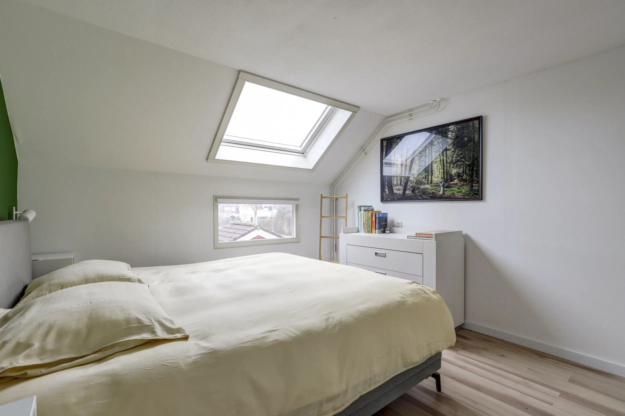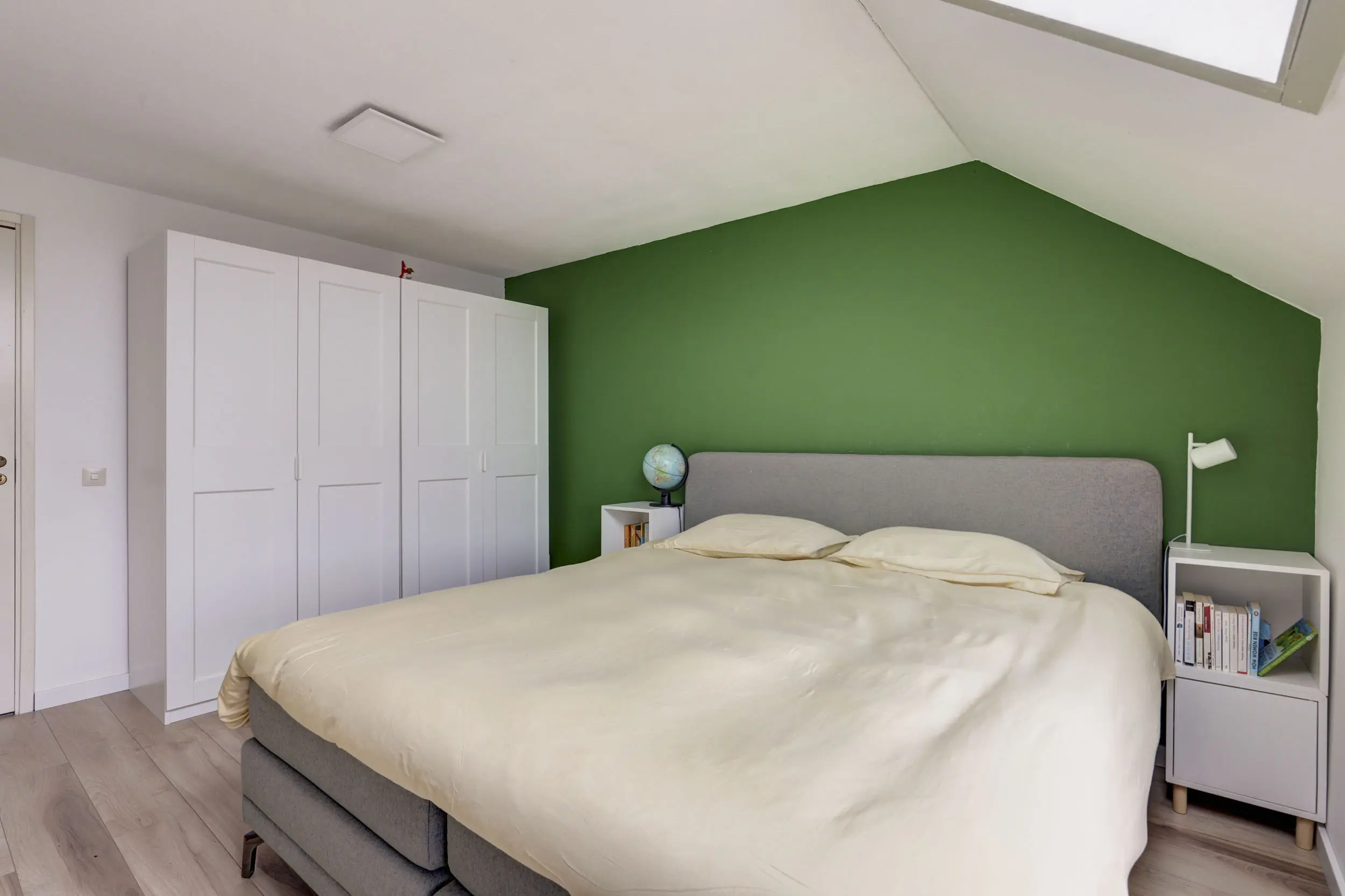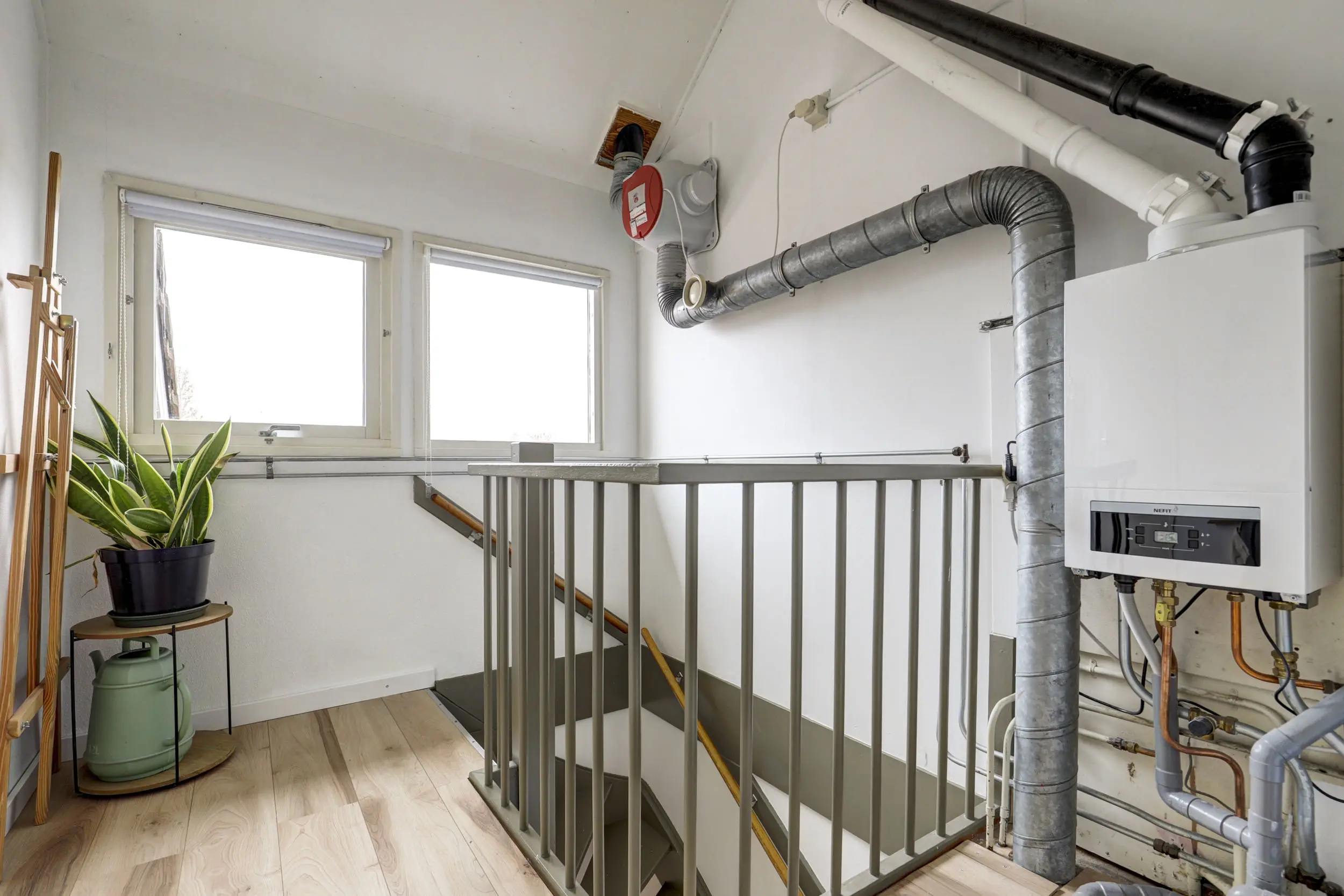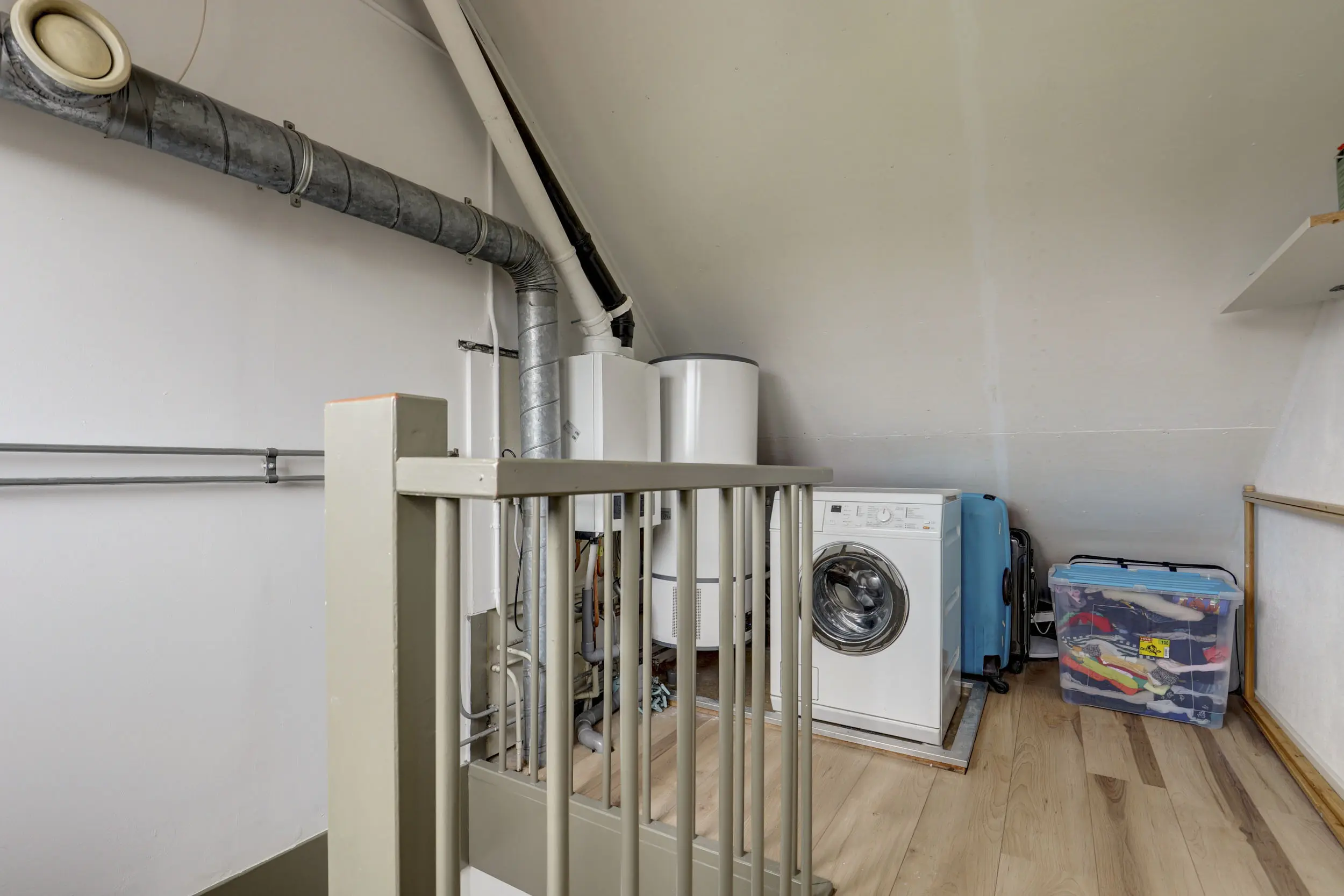 Met de vaste trap kom je boven op de tweede verdieping. Hier bevindt zich de opstelling voor de CV-ketel (Nefit 2024) en de warmtepompboiler. Daarnaast tref je hier ook de witgoed aansluitingen. Wellicht de allergrootste slaapkamer kom je hier tegen; naast het formaat van dik 4 meter bij bijna 3,5 meter, is de hoge nok ook heel erg prettig voor de ruimte beleving! Verkopers hebben deze ruimte recent geheel gerenoveerd en dankzij de twee grote Velux dakvensters hebben zij hier een enorme en lichte ruimte gecreëerd!