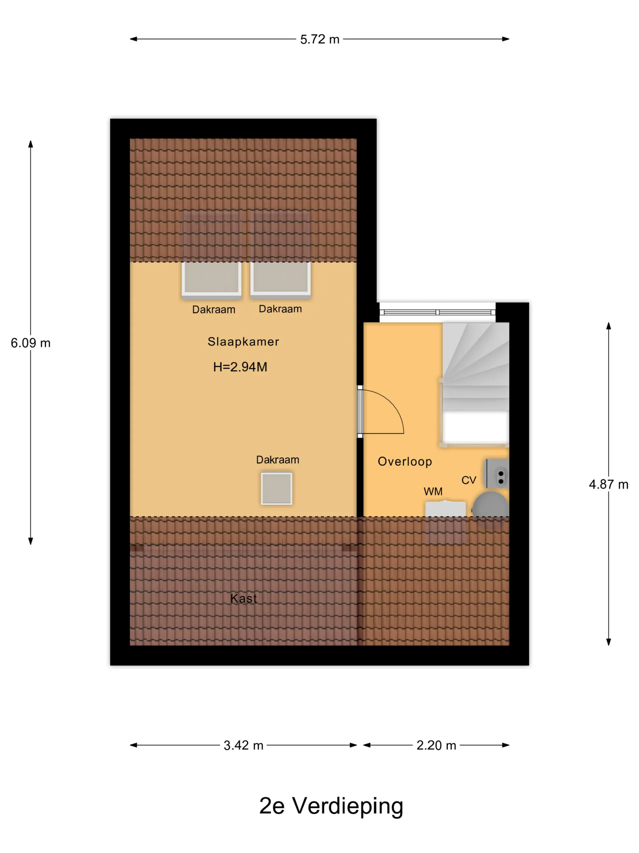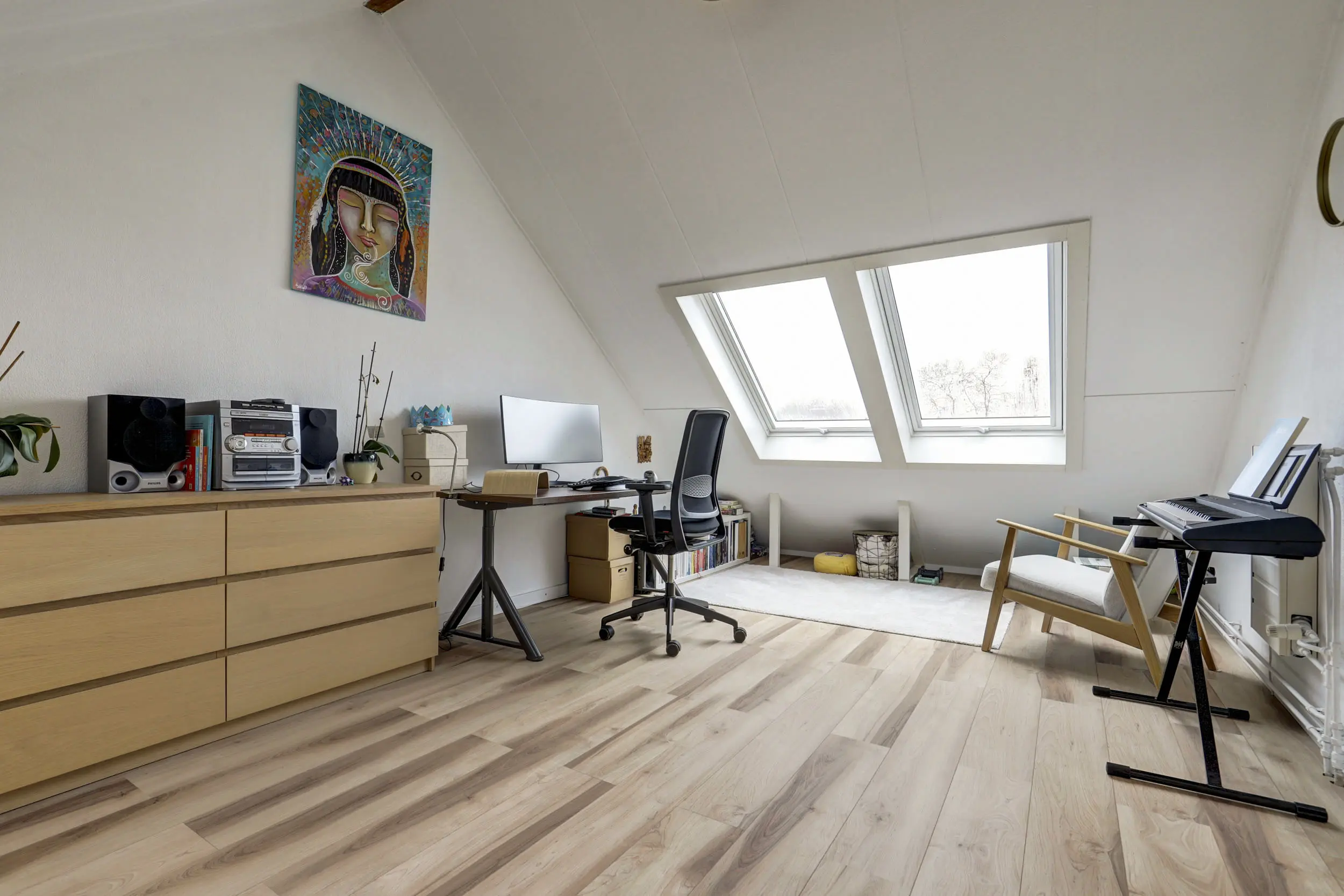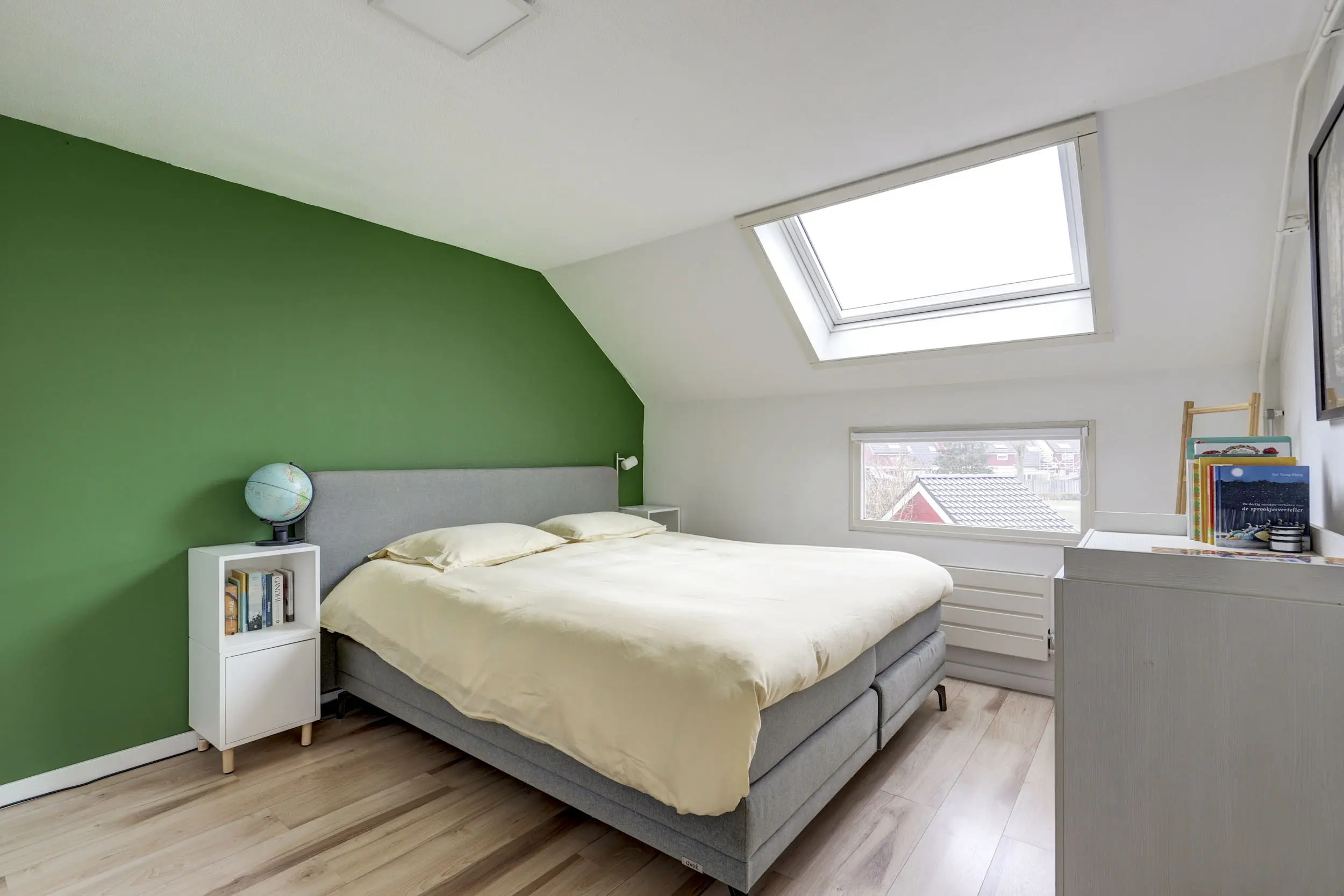 Met de vaste trap kom je boven op de tweede verdieping. Hier bevindt zich de opstelling voor de CV-ketel (Nefit 2024) en de warmtepompboiler. Daarnaast tref je hier ook de witgoed aansluitingen. Wellicht de allergrootste slaapkamer kom je hier tegen; naast het formaat van dik 4 meter bij bijna 3,5 meter, is de hoge nok ook heel erg prettig voor de ruimte beleving! Verkopers hebben deze ruimte recent geheel gerenoveerd en dankzij de twee grote Velux dakvensters hebben zij hier een enorme en lichte ruimte gecreëerd!