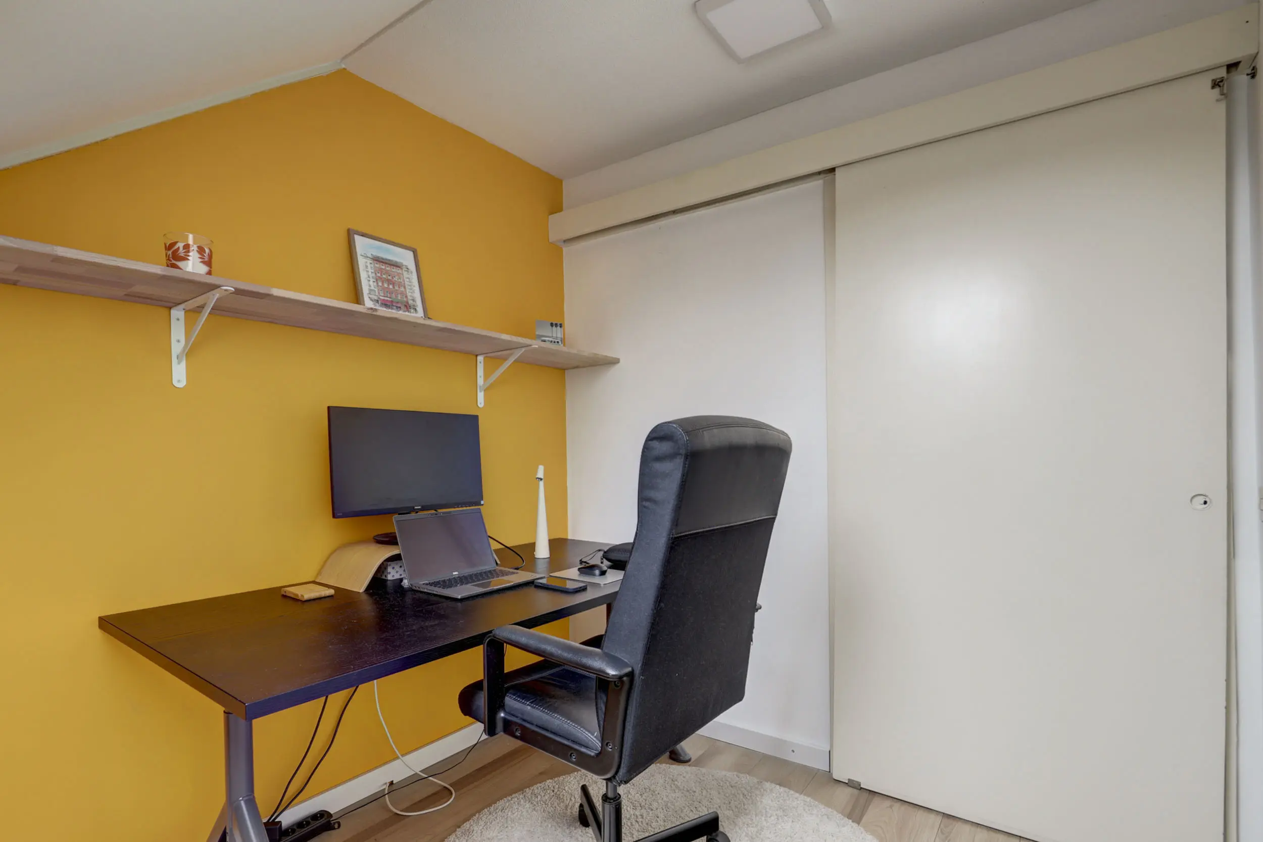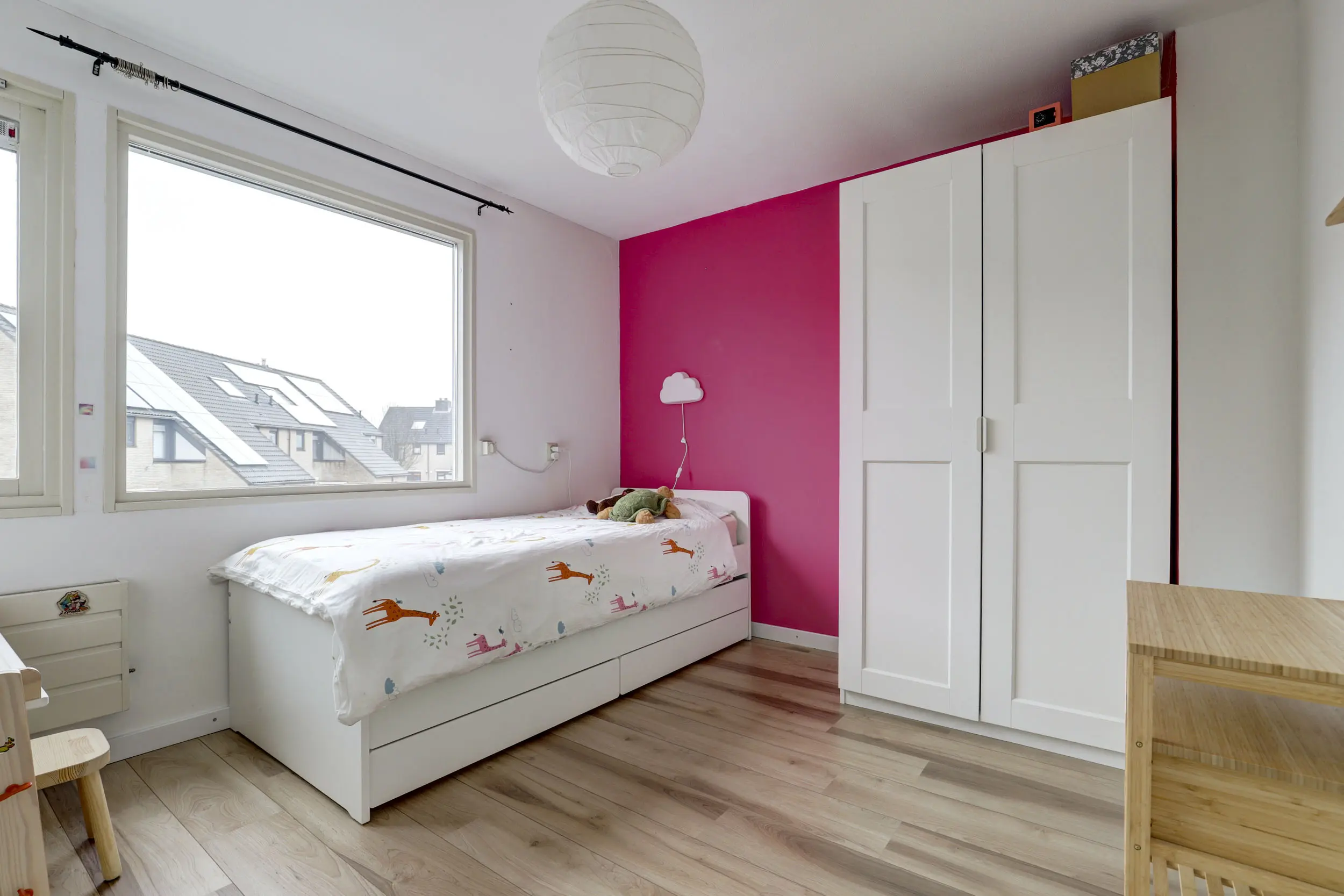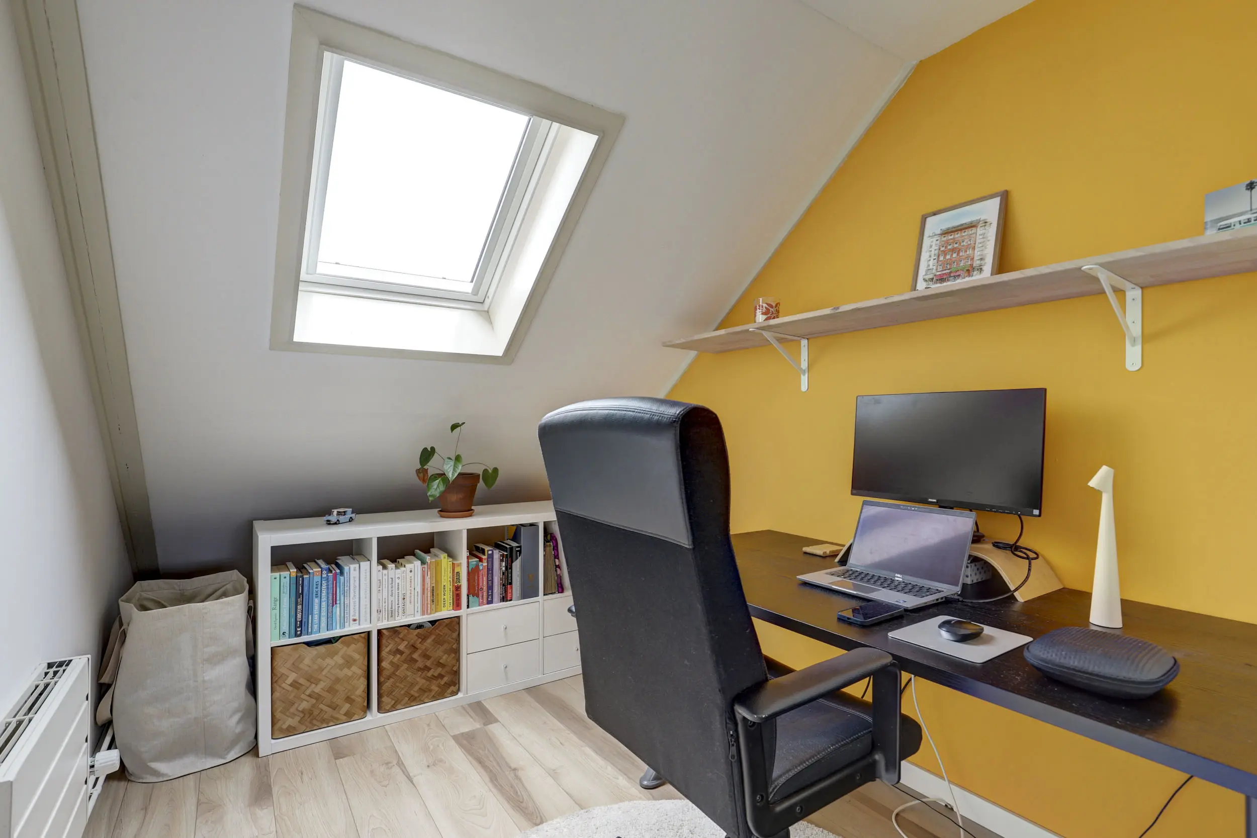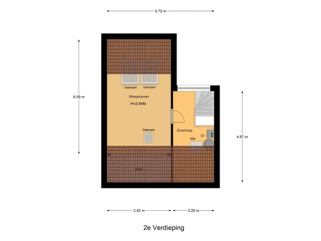 Met de vaste trap kom je boven op de tweede verdieping. Hier bevindt zich de opstelling voor de CV-ketel (Nefit 2024) en de warmtepompboiler. Daarnaast tref je hier ook de witgoed aansluitingen. Wellicht de allergrootste slaapkamer kom je hier tegen; naast het formaat van dik 4 meter bij bijna 3,5 meter, is de hoge nok ook heel erg prettig voor de ruimte beleving! Verkopers hebben deze ruimte recent geheel gerenoveerd en dankzij de twee grote Velux dakvensters hebben zij hier een enorme en lichte ruimte gecreëerd!