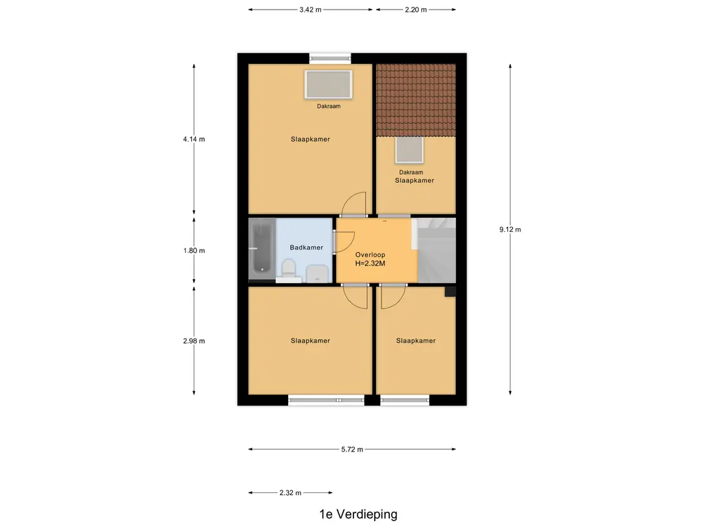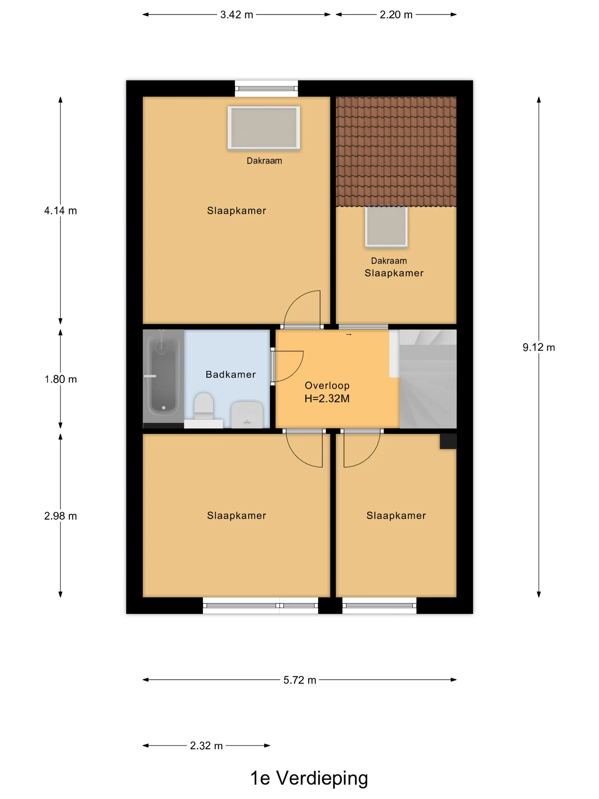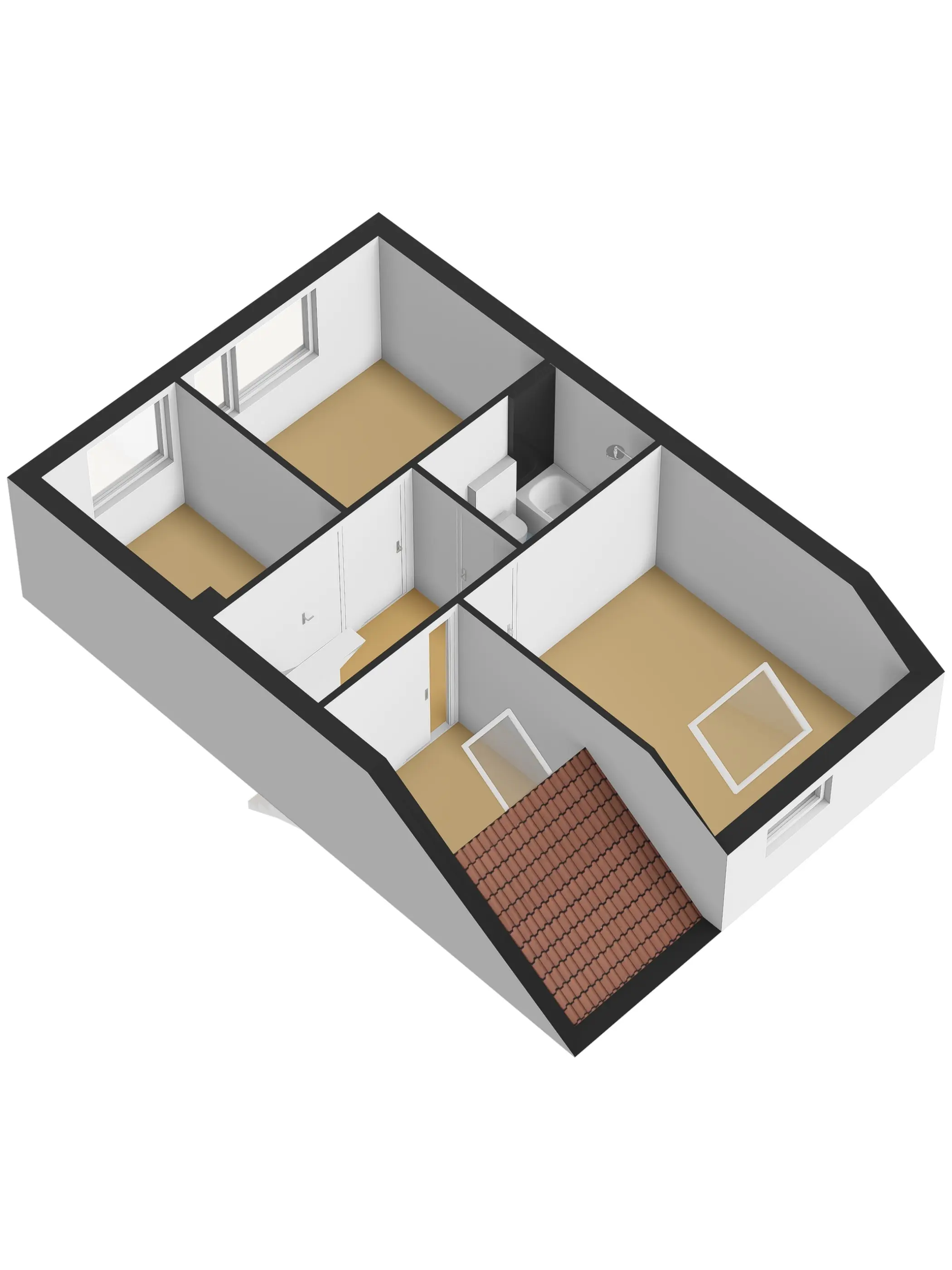 De overloop geeft toegang tot alle vier de slaapkamers. Alle slaapkamers zijn van een verschillend formaat zodat er voor iedere wens wel een oplossing te maken is! De badkamer is centraal in het midden gelegen en geheel betegeld. De badkamer is voorzien van een ruim ligbad met scherm, zodat douchen in bad ook nog steeds een mogelijkheid is. Daarnaast heeft deze badkamer nog de beschikking over een vaste wastafel en een zwevend toilet.