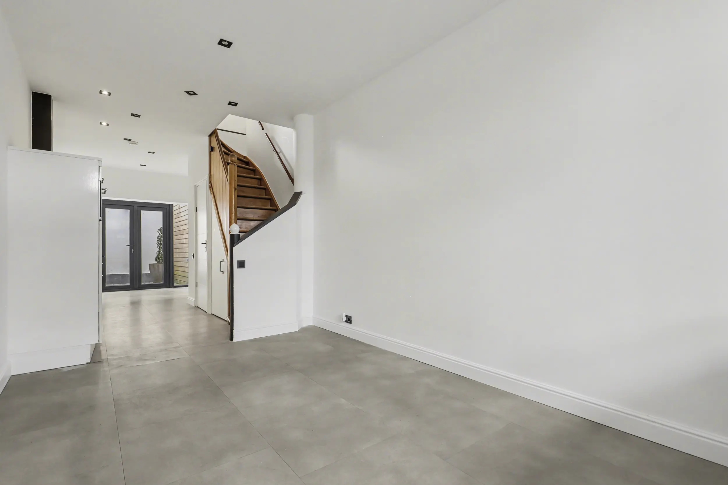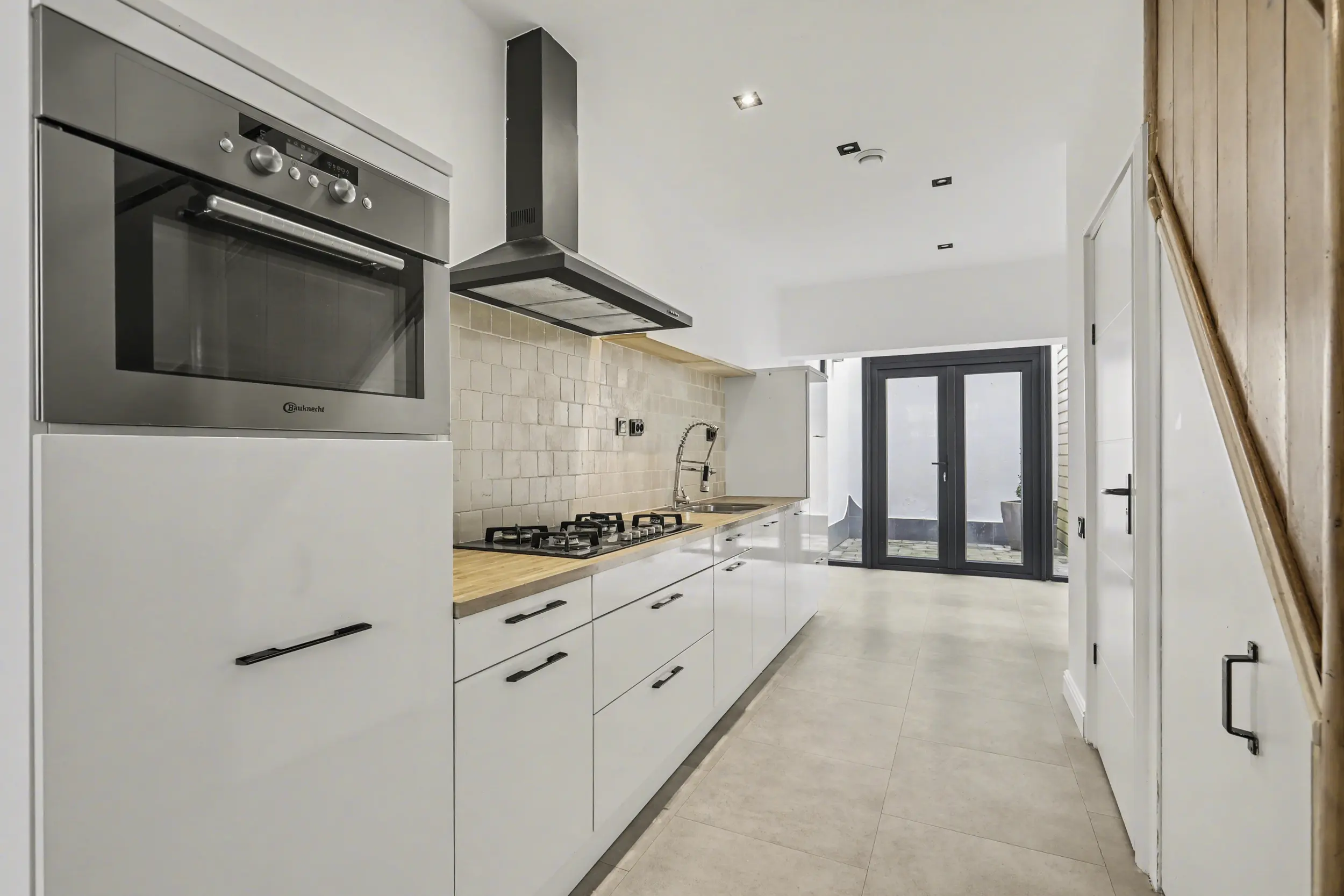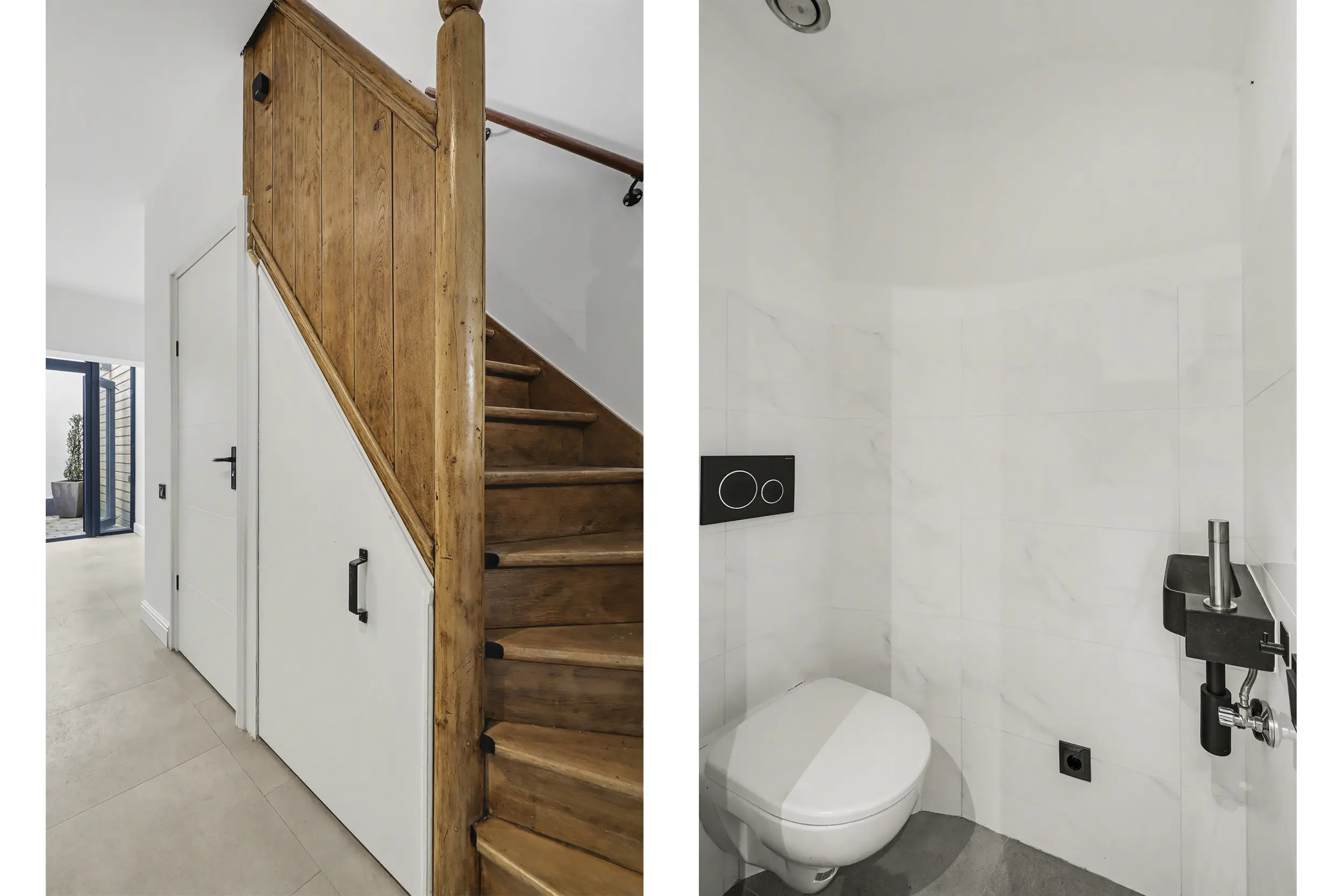 Tegenover de keuken bevindt zich het toilet met fonteintje. In de trapkast treft u de aansluitingen voor de wasapparatuur en de verdeler van de vloerverwarming. Via de openslaande deuren aan de achterzijde loopt u zo de patio in.