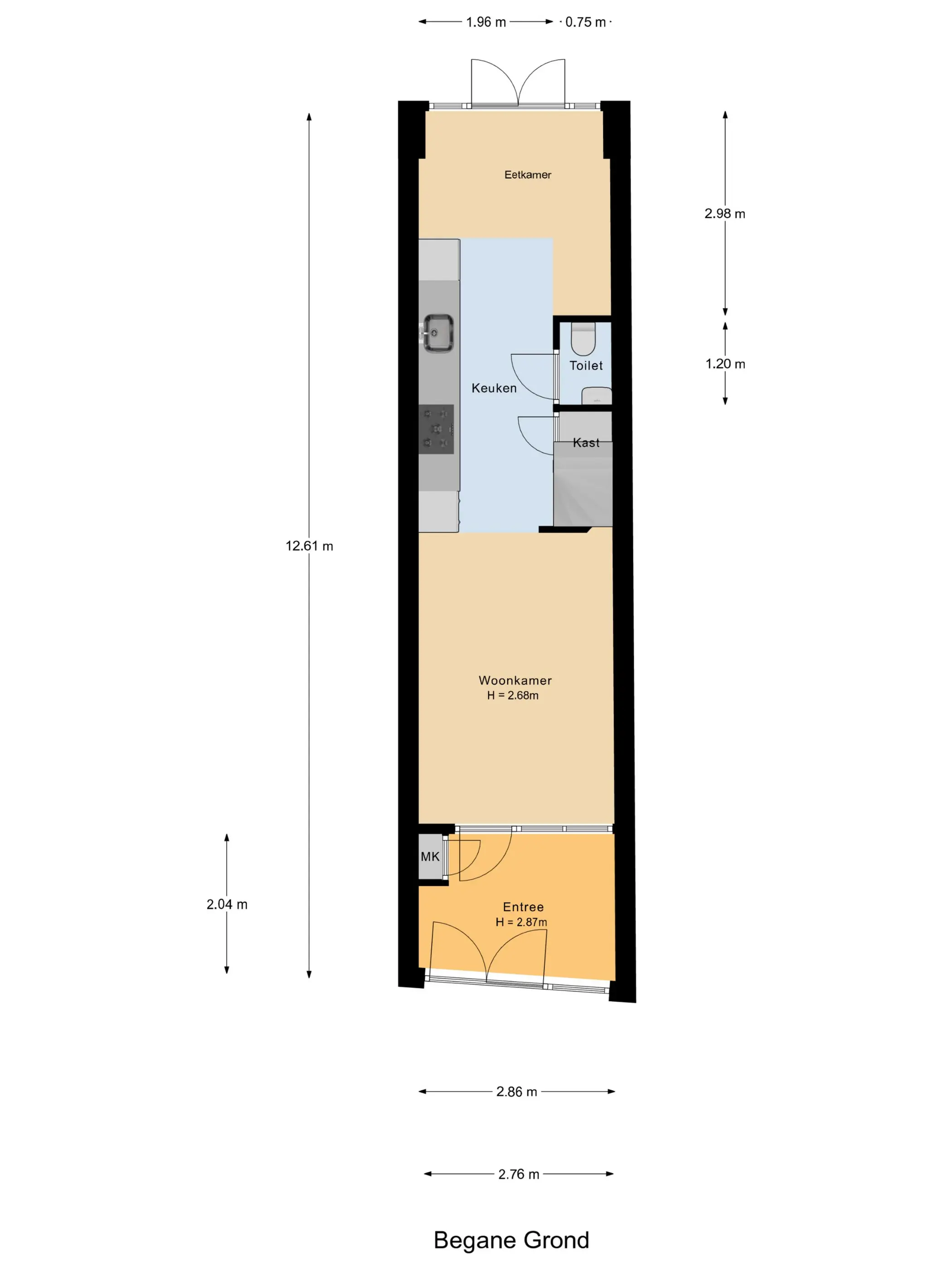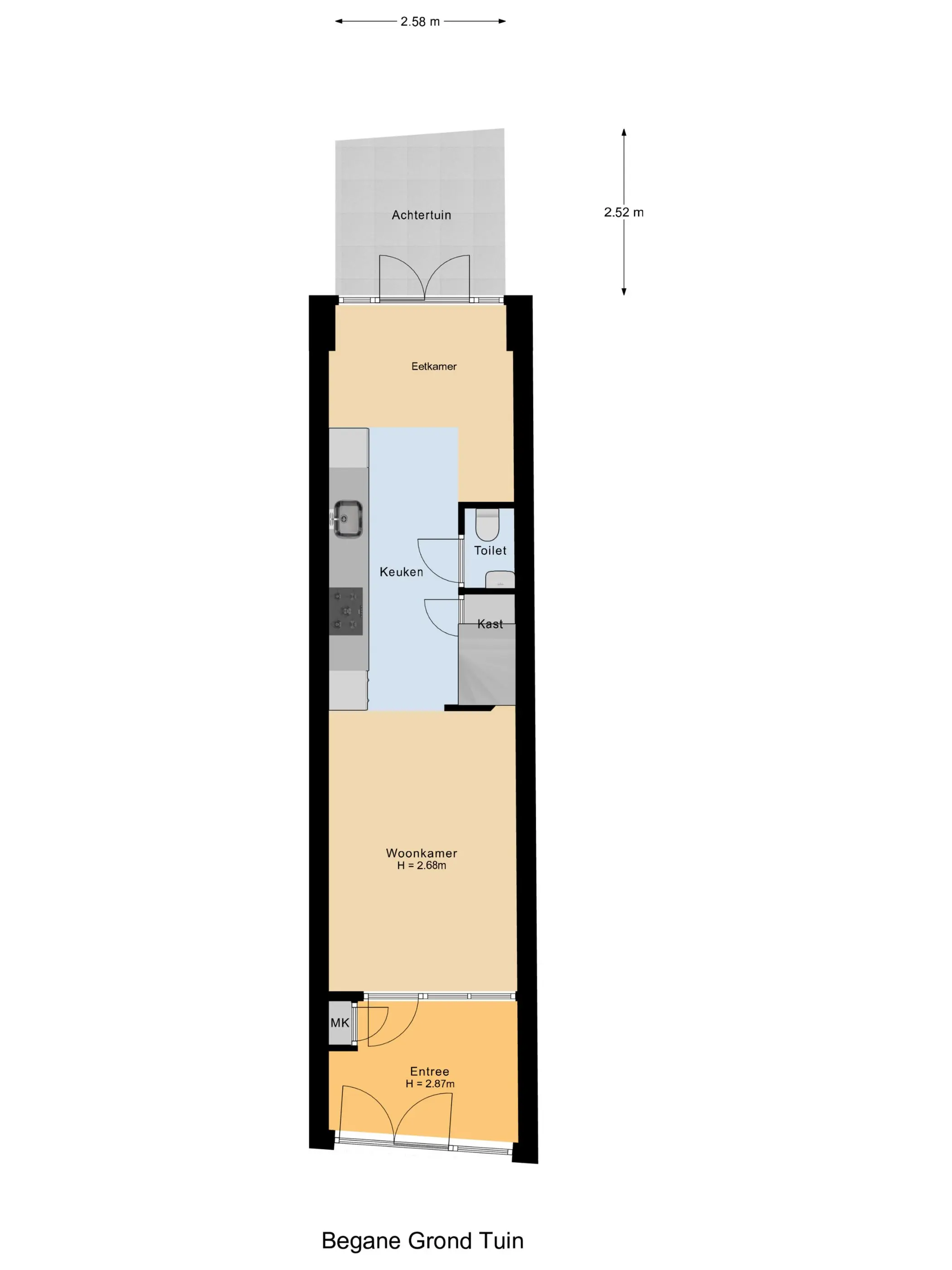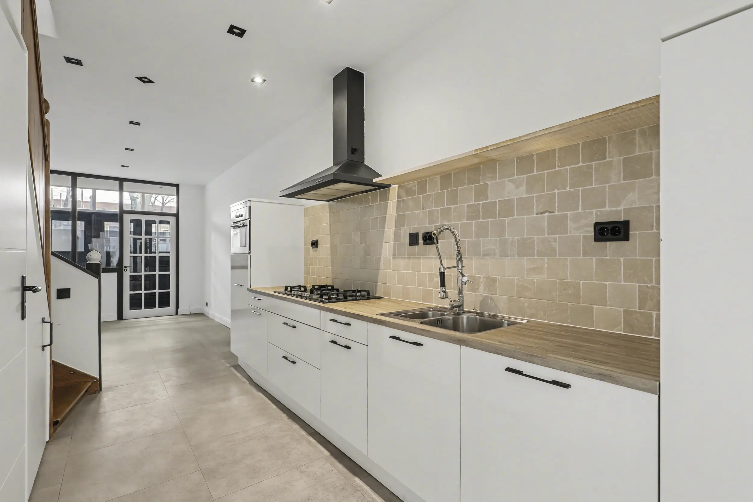 Tegenover de keuken bevindt zich het toilet met fonteintje. In de trapkast treft u de aansluitingen voor de wasapparatuur en de verdeler van de vloerverwarming. Via de openslaande deuren aan de achterzijde loopt u zo de patio in.