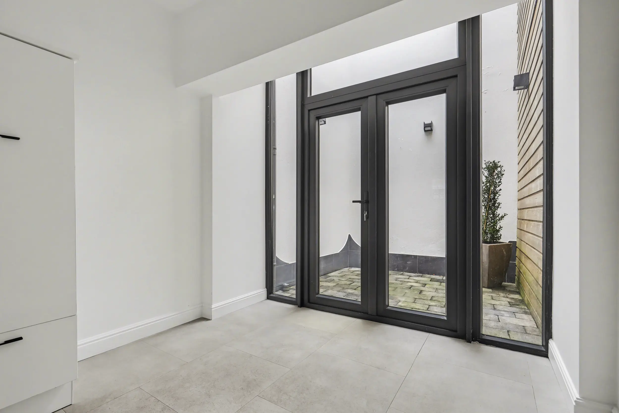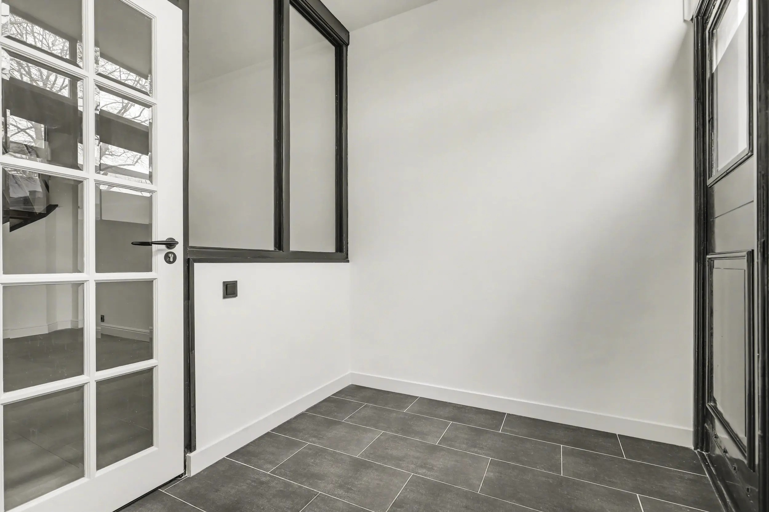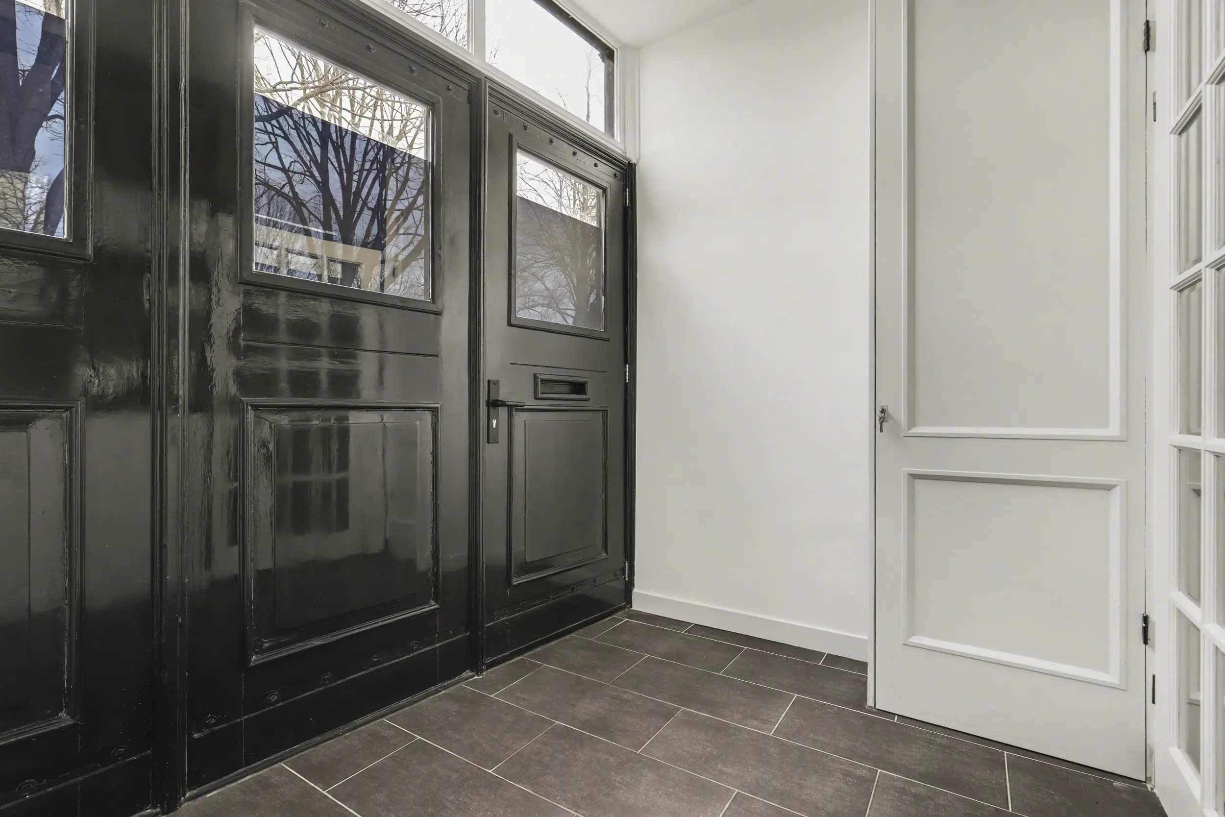 Via de fraaie voordeur betreedt u het voorportaal, dat is afgewerkt met een stijlvolle tegelvloer. Hier bevindt zich tevens de vernieuwde meterkast. Deze ruimte is bovendien ideaal te gebruiken voor het stallen van fietsen.