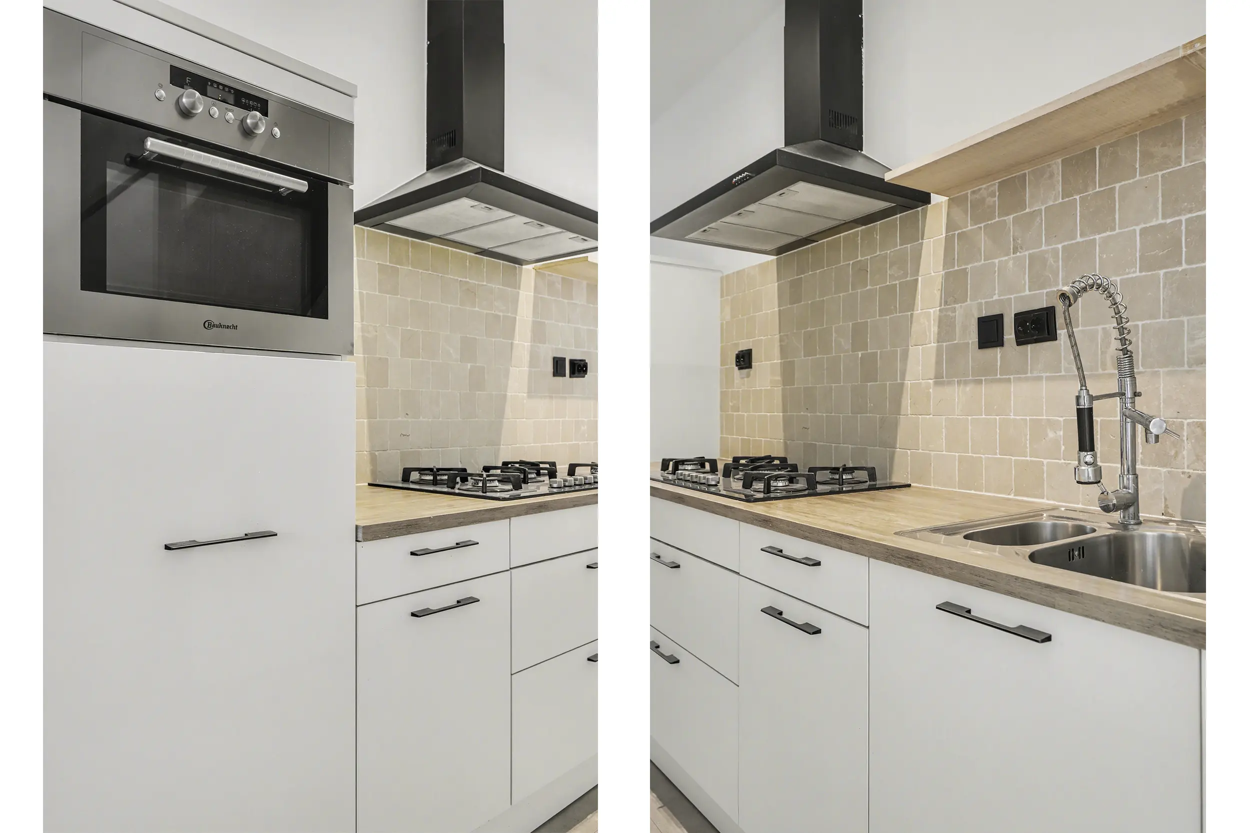 De keuken is compleet uitgerust met diverse inbouwapparatuur, waaronder een combi-oven, vriezer, koelkast, vaatwasser, een 5-pits gaskookplaat en een afzuigkap. Het geheel is afgewerkt met een kunststof werkblad en een praktische 1,5 spoelbak.