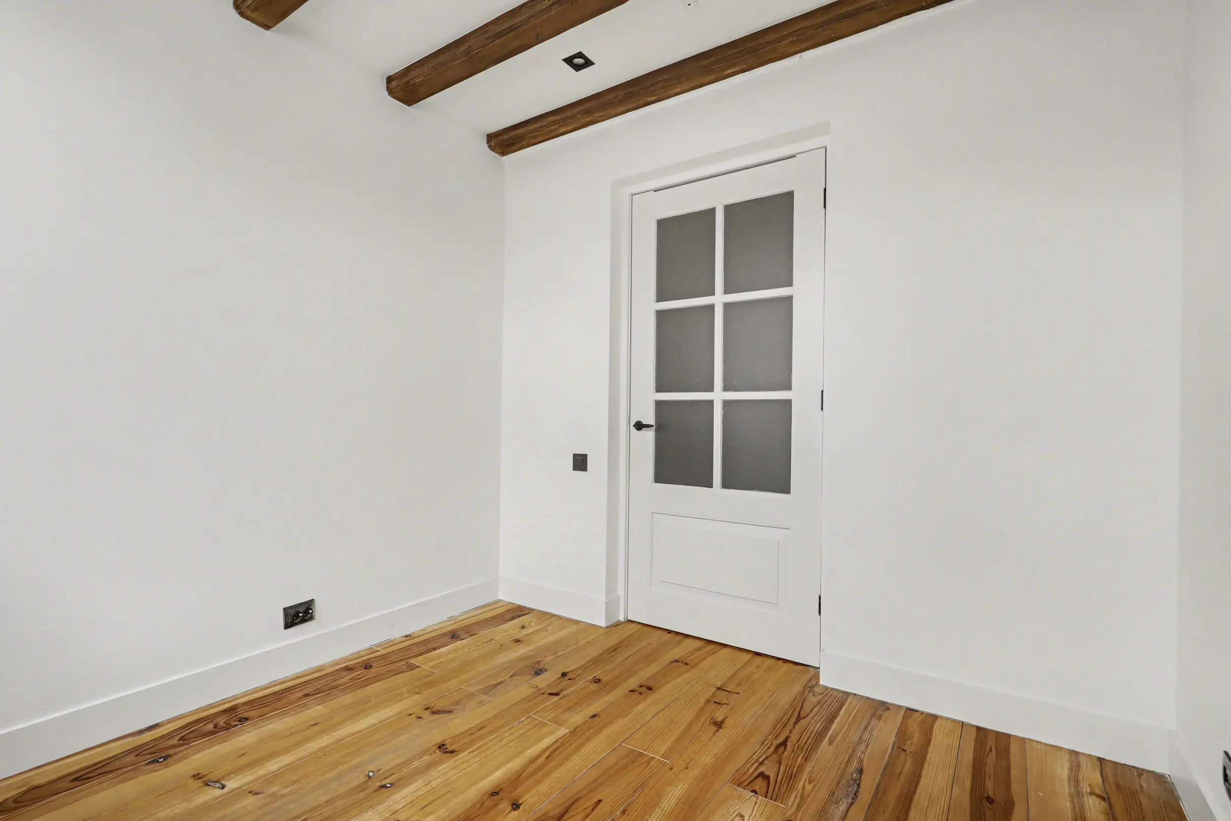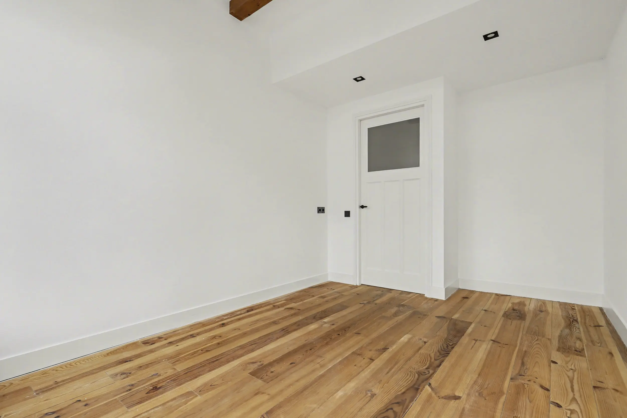 De ruime overloop geeft toegang tot twee slaapkamers en de badkamer. De gehele verdieping is stijlvol afgewerkt met een prachtige grenenhouten vloer en strak gestucte wanden en plafonds.