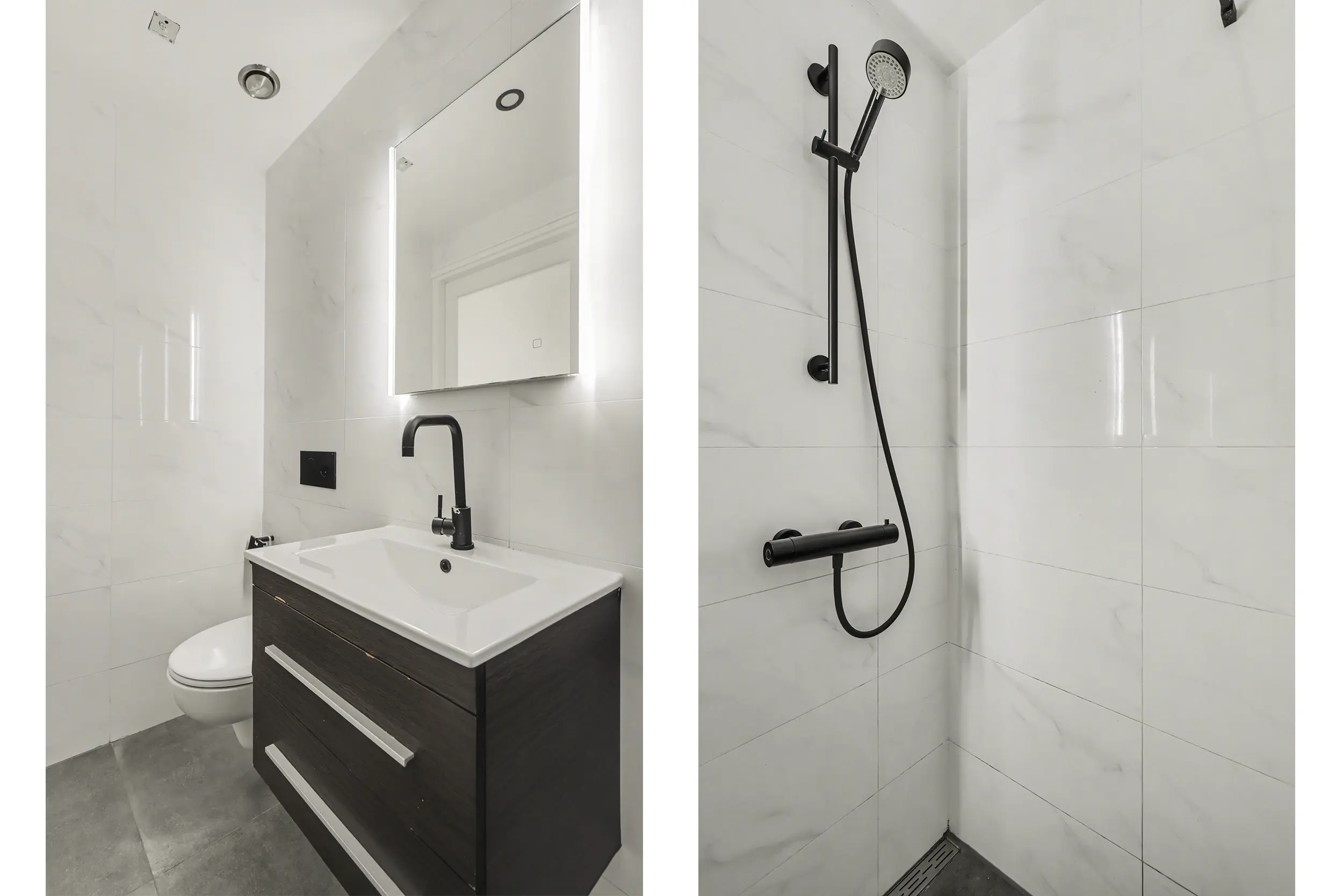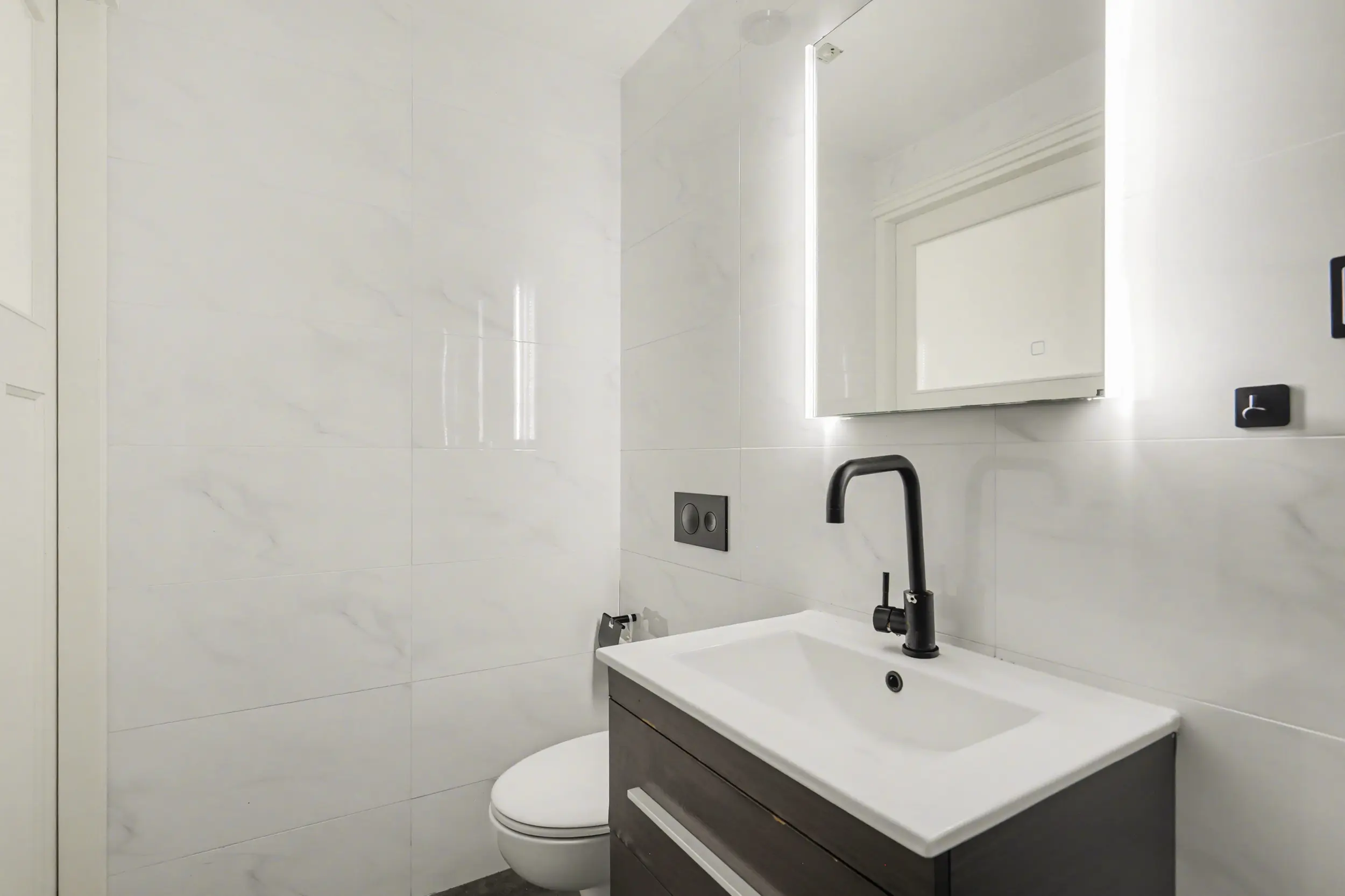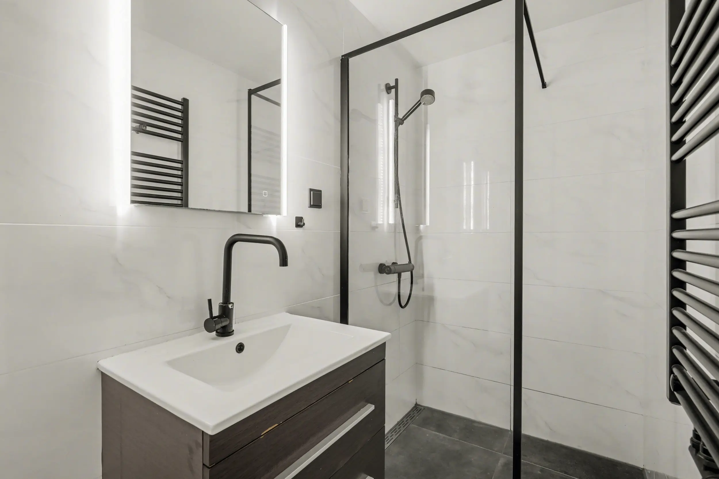 De moderne badkamer is volledig betegeld en van alle gemakken voorzien. U beschikt hier over een ruime inloopdouche met glaswand, een fraai badmeubel met wastafel en verlichte spiegel, een wandcloset en een designradiator. Daarnaast is er mechanische ventilatie aanwezig en is het plafond voorzien van stijlvolle ledspots.