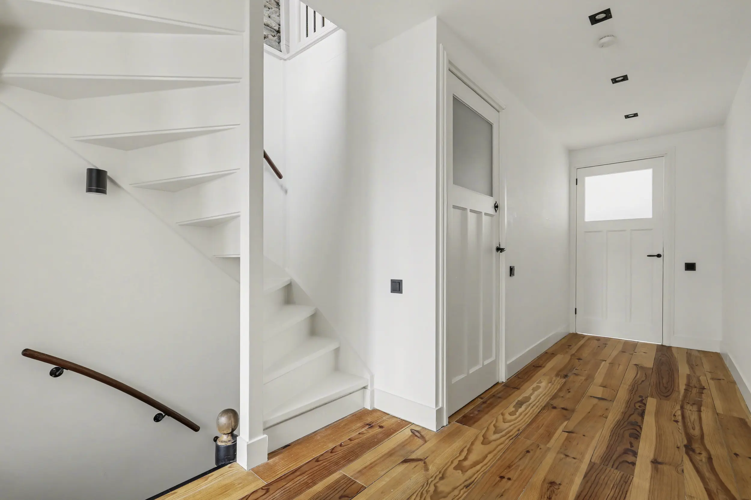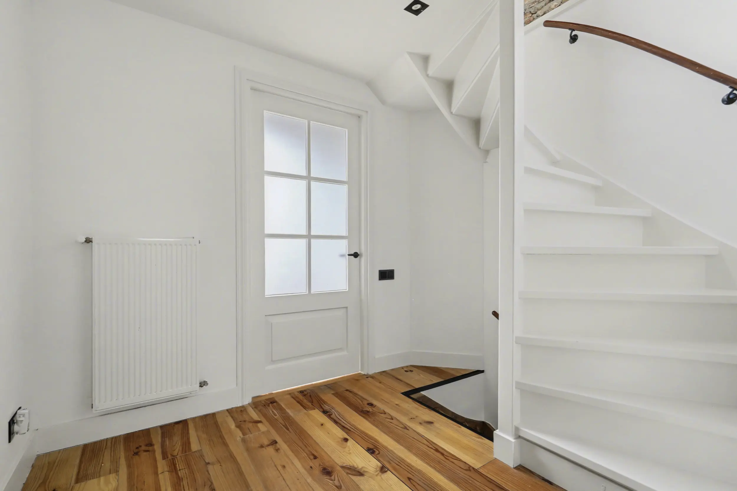Ook hier ligt een fraaie grenenhouten vloer. Naast de trap bevindt zich een vaste kast met daarin de CV-ketel (2021) en de mechanische ventilatie-unit.