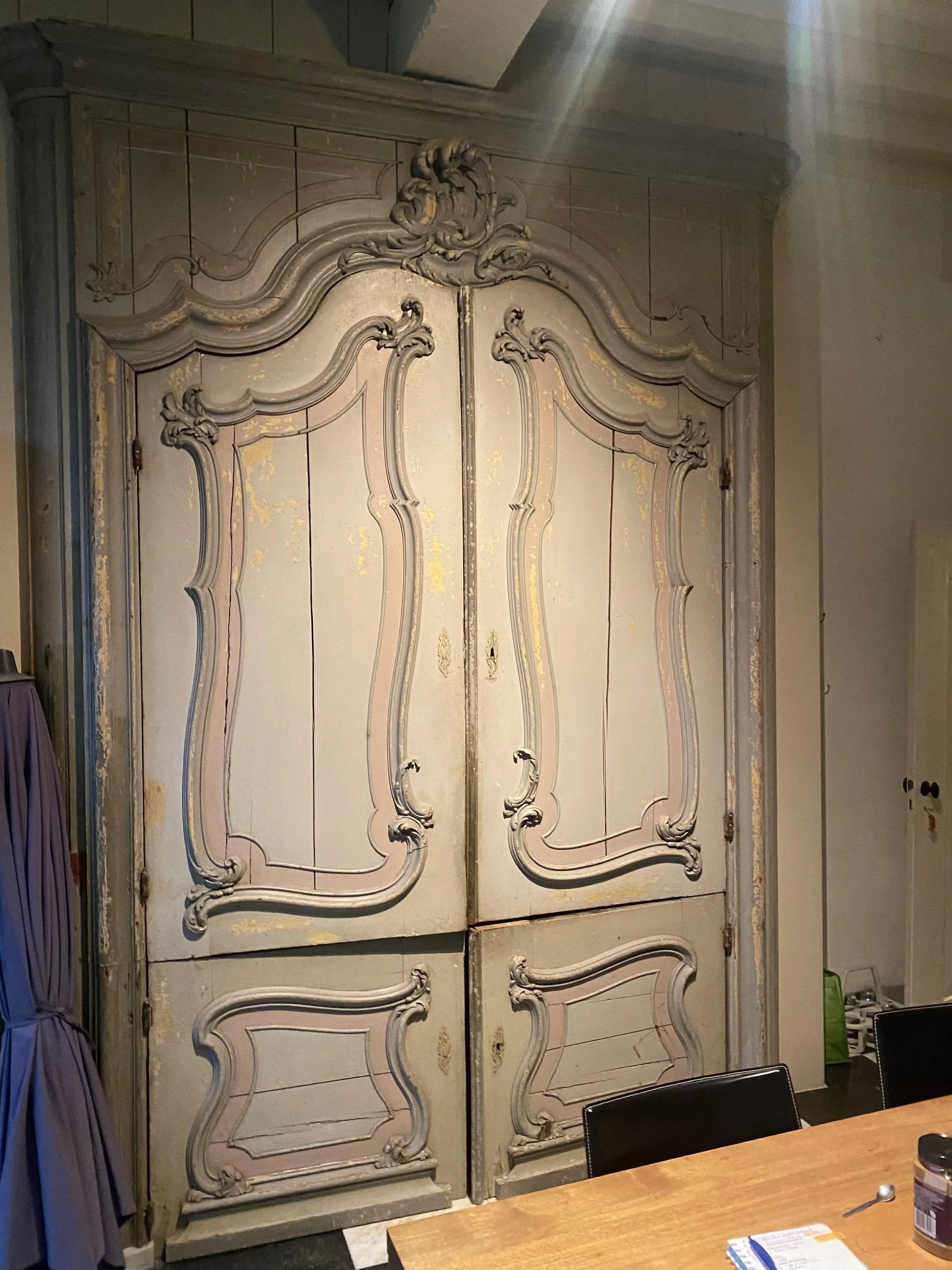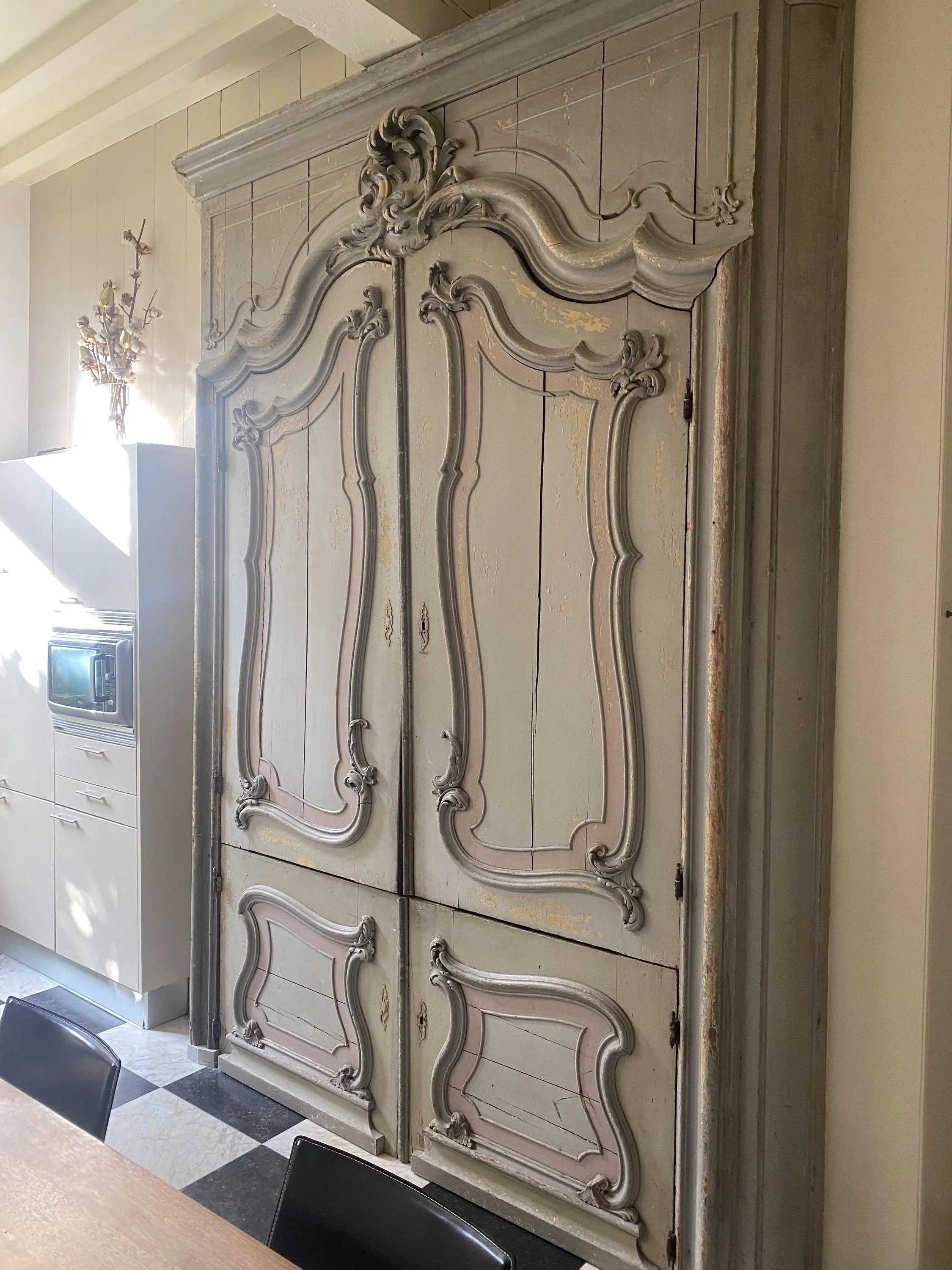 Vanuit de centrale gang komen we uit in de zeer ruime en lichte woonkeuken met zo mogelijk een nog machtigere kast (rond 1760) voorzien van rococo elementen die eigenlijk direct alle aandacht opeist.