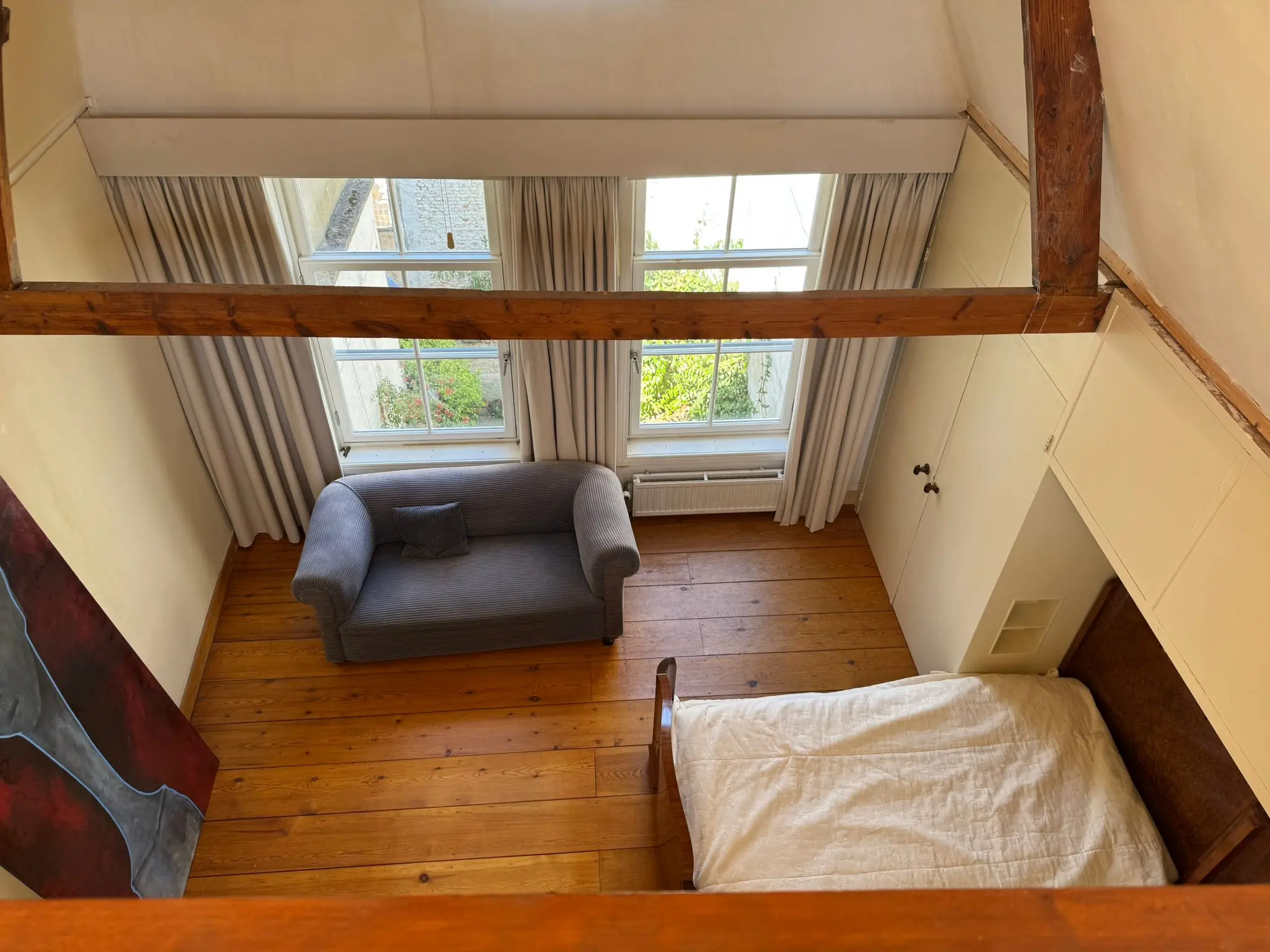 Aan de tuinzijde is een kamer welke momenteel in gebruik is als slaapkamer gelegen. Deze ruimte beschikt over brede grenen vloerdelen en de 16e-eeuwse balklaag is hier nog mooi zichtbaar. De slaapkamer beschikt over een en suite badkamer. Maar dat niet alleen. Vanuit deze kamer is ook het balkonnetje te betreden.