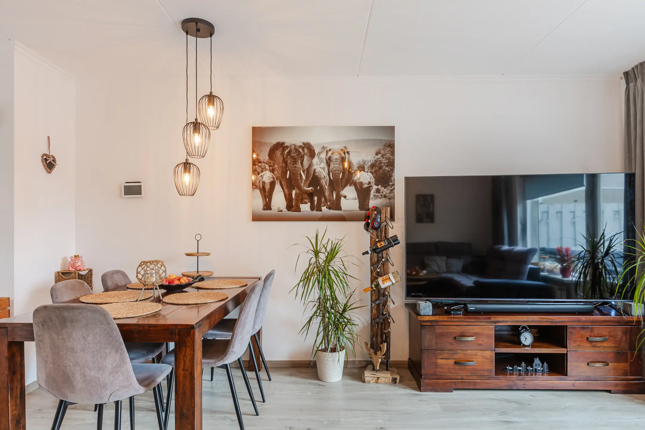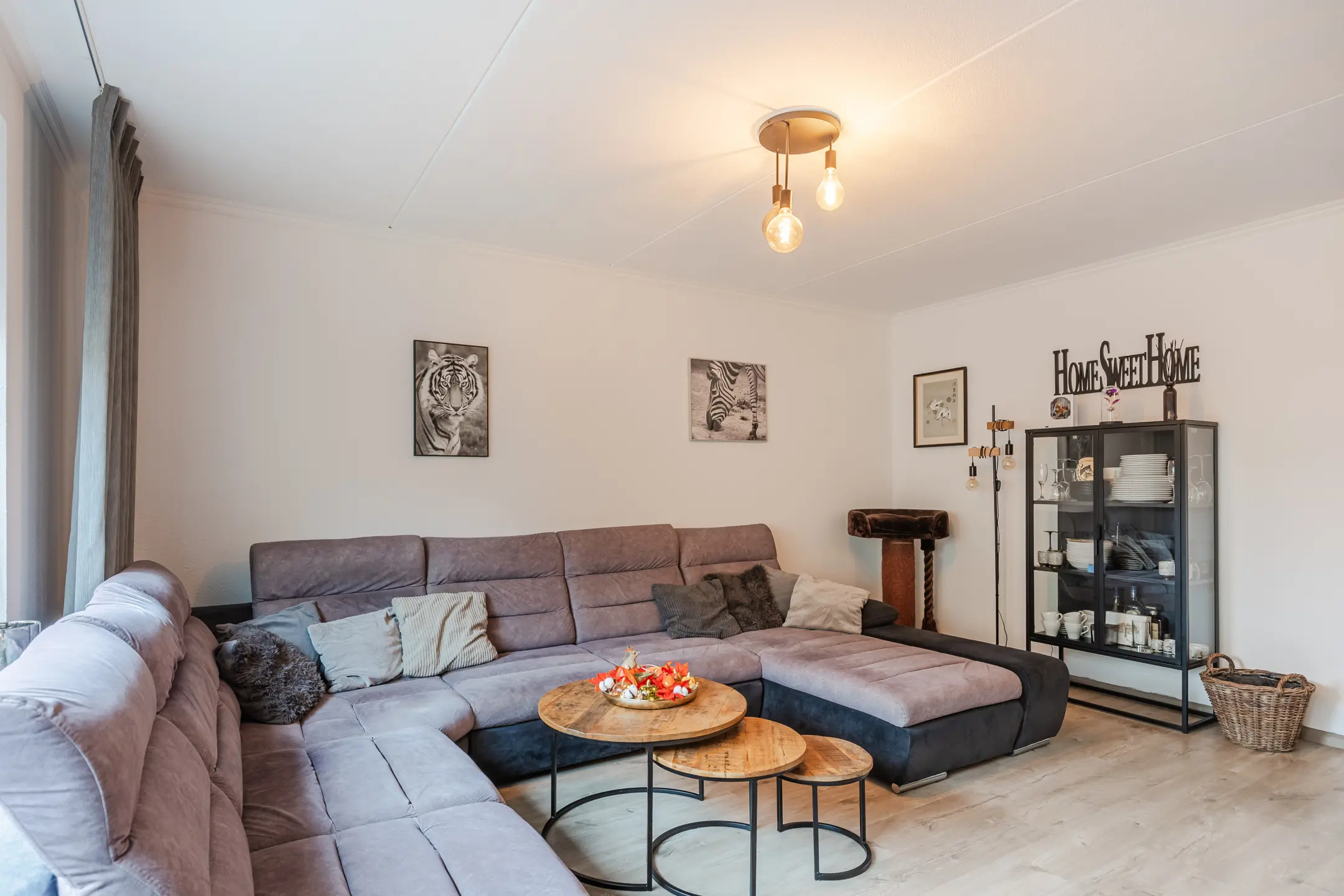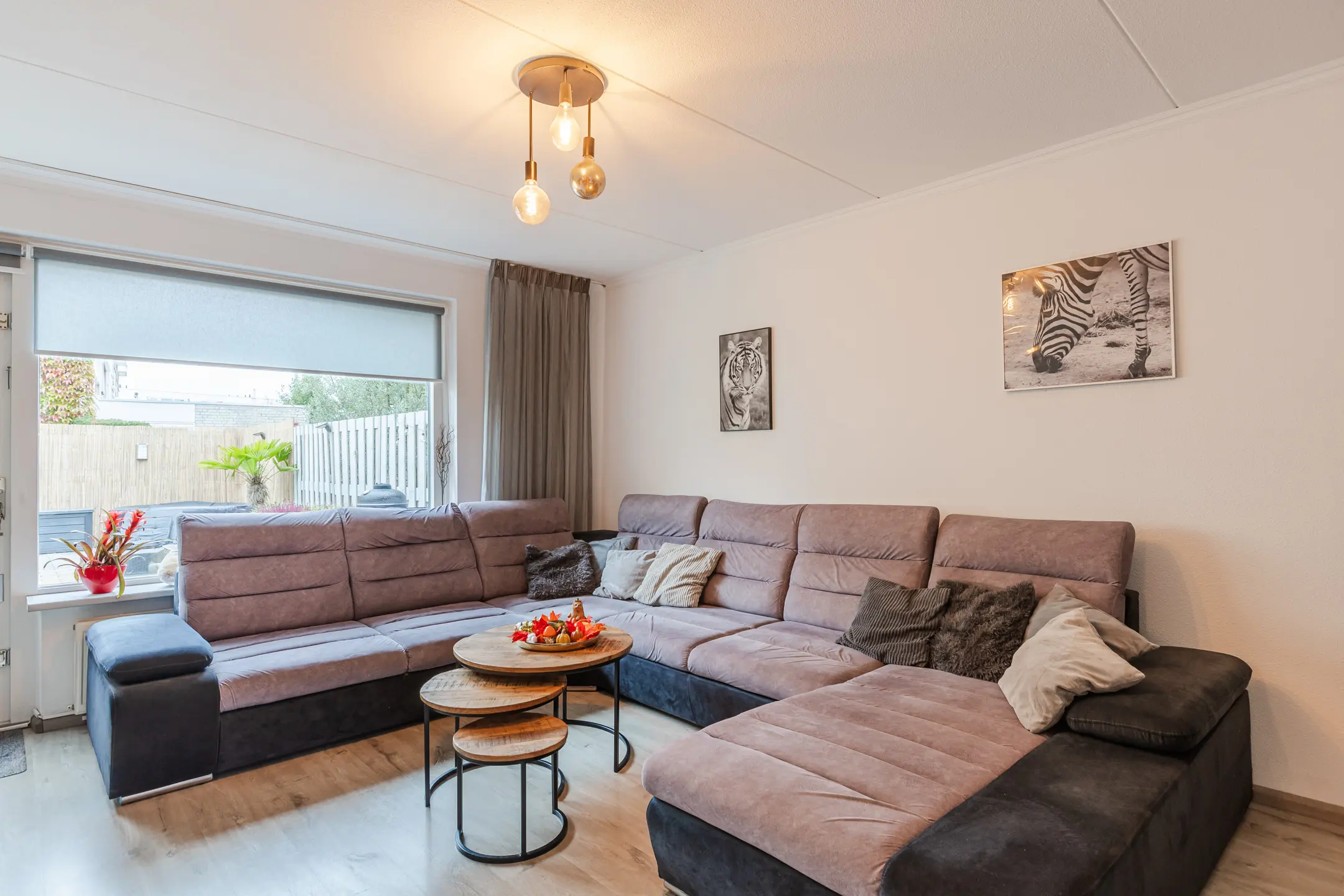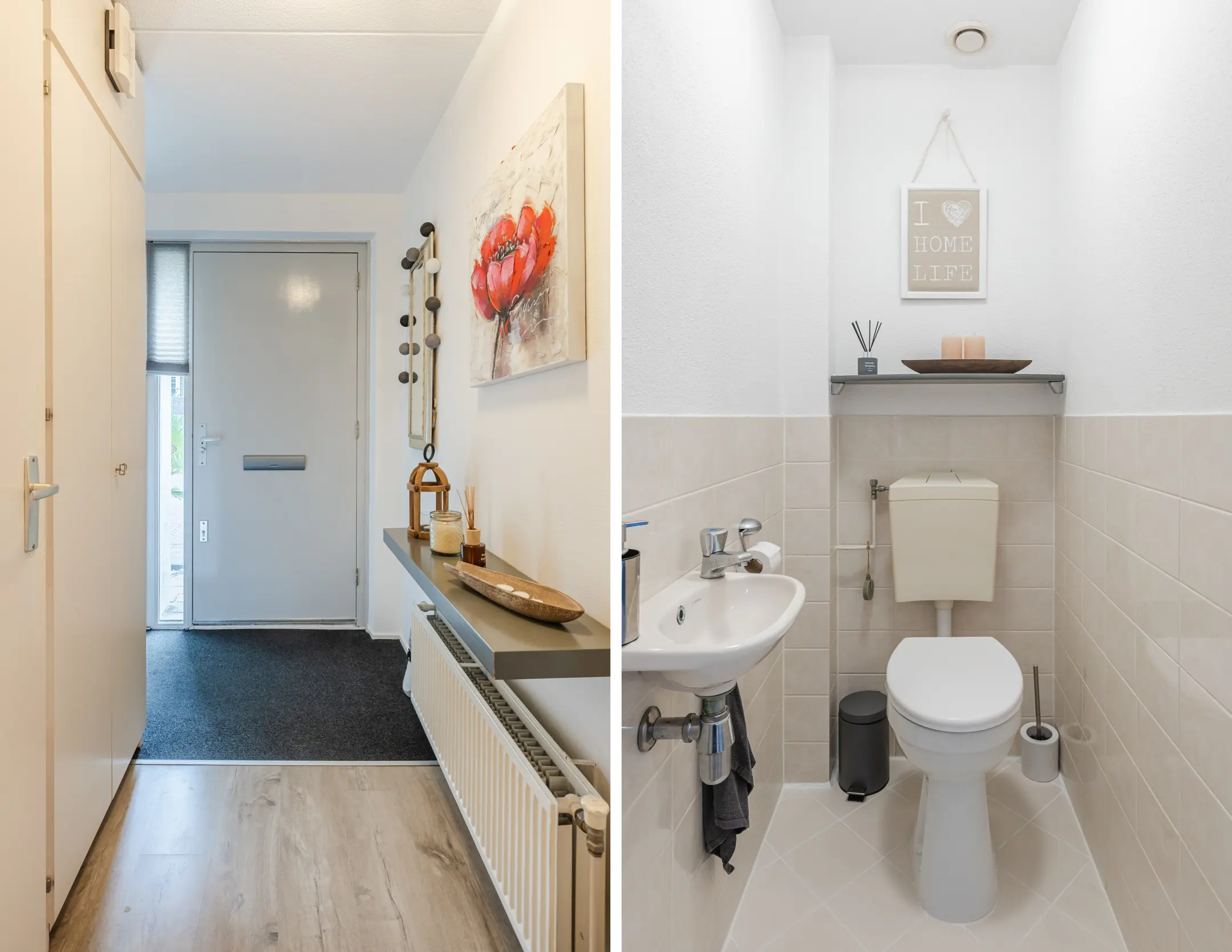 Bij binnenkomst valt direct de verzorgde en lichte sfeer op. In de hal bevinden zich de meterkast, een praktische bergruimte, het toilet en de trapopgang naar boven. De laminaatvloer loopt door in de woonkamer en keuken, wat zorgt voor een rustig en harmonieus geheel. De tuingerichte woonkamer is ruim en licht, met een grote raampartij die zorgt voor veel daglicht en direct toegang biedt tot de achtertuin. Hier kun je heerlijk ontspannen of gezellig borrelen met vrienden, terwijl je geniet van de rustige ligging en de groene omgeving.