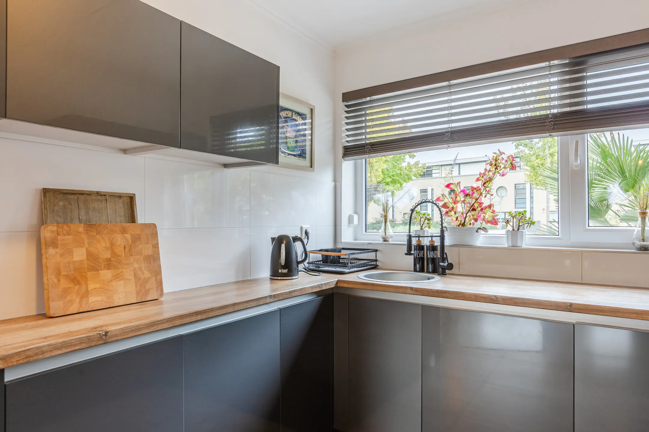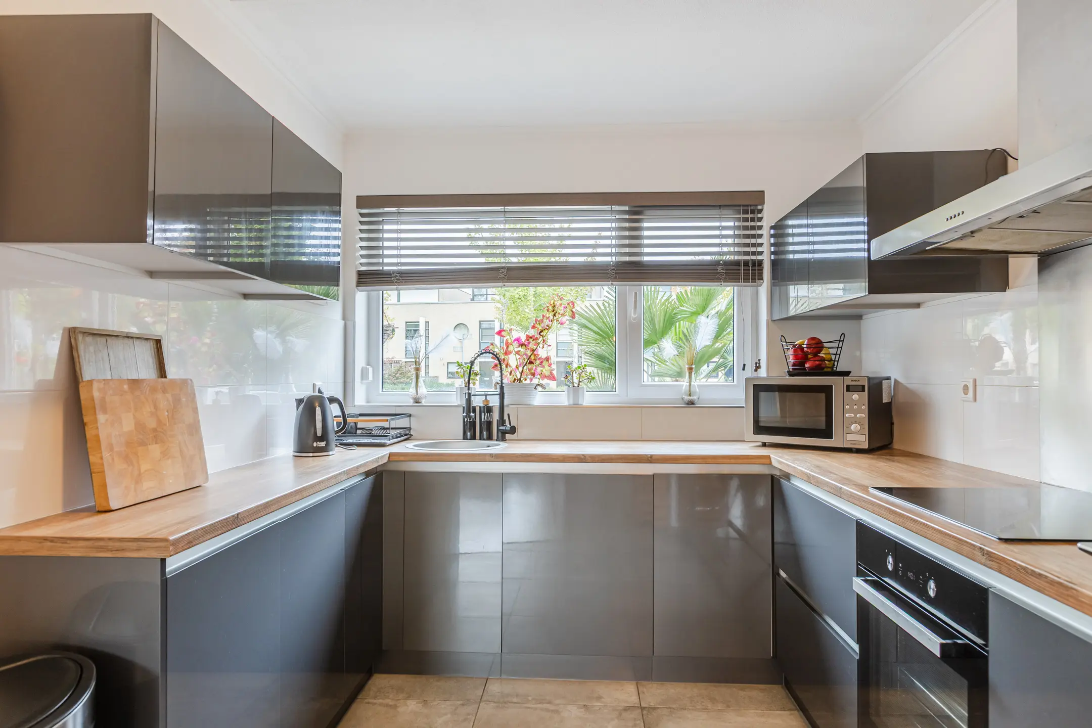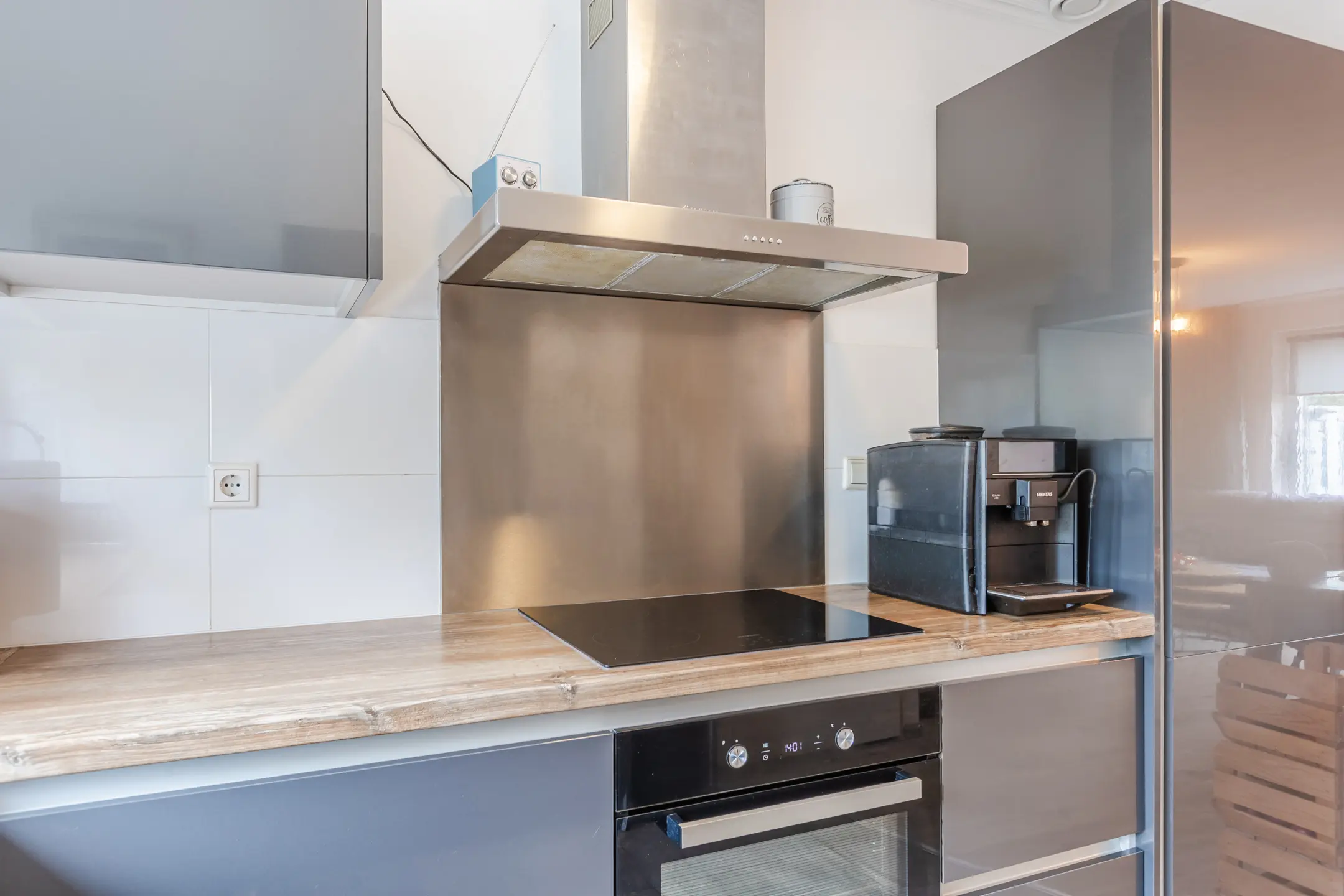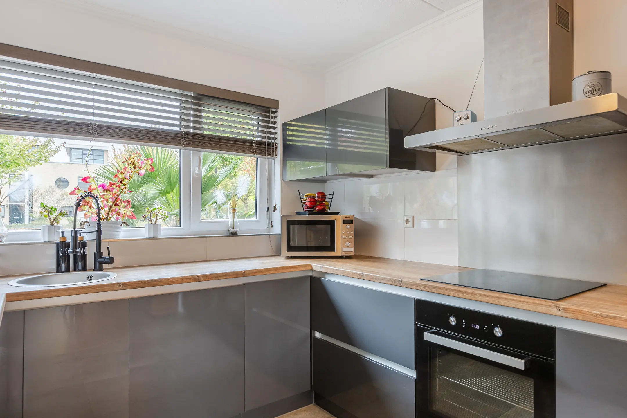 Aan de voorzijde bevindt zich de moderne open keuken, uitgevoerd in een praktische hoekopstelling en voorzien van diverse inbouwapparatuur, waaronder een vaatwasser, combi-oven, magnetron, gaskookplaat met afzuigkap en een koelkast – grotendeels van het kwaliteitsmerk Bosch. Dankzij het grote keukenraam met elektrisch rolluik geniet je van prettig licht tijdens het koken en uitzicht op de rustige straat.