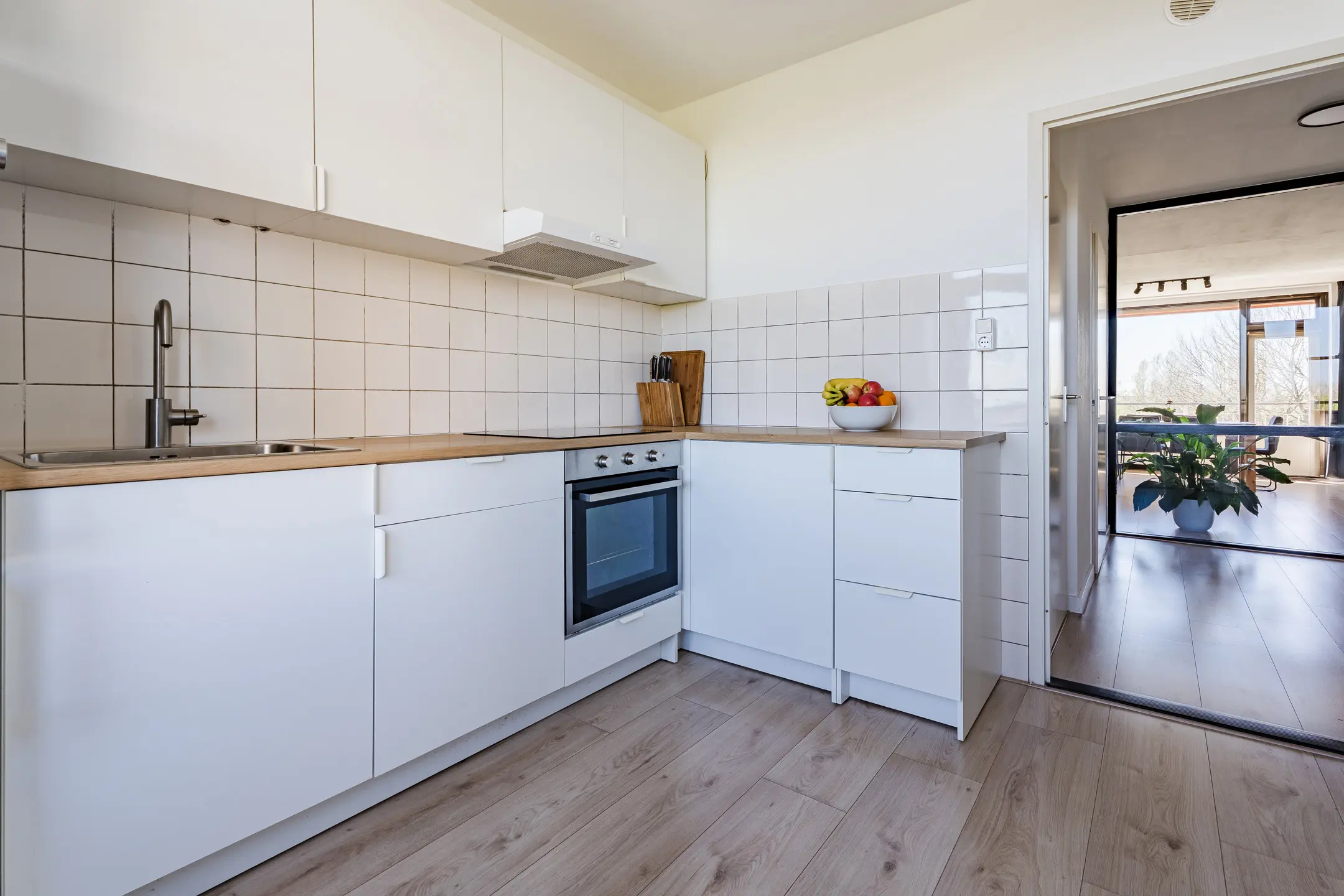 De grote keuken aan de voorzijde biedt volop mogelijkheden. Dankzij de ruimte voor een eettafel is dit niet alleen een plek om te koken, maar ook om samen te komen. De keuken is voorzien van een inductiekookplaat, oven en afzuigkap, zodat je direct aan de slag kunt.